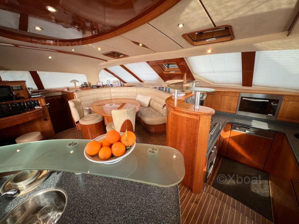 Ce PRIVILEGE 585 d'occasion offre un aménagement original et pratique avec 4 cabines doubles propriétaire et 2 pointes avant pour l'équipage. Sa cuisine en hauteur, ouverte sur le carré, crée un espace de vie lumineux et convivial. Les deux grands réfrigérateurs sont situés dans la coursive tribord, et le carré arrondi, équipé d’une table télescopique, conserve sa banquette en cuir beige d’origine, offrant une ambiance chaleureuse et raffinée grâce notamment aux finitions en merisier propre à PRIVILEGE.