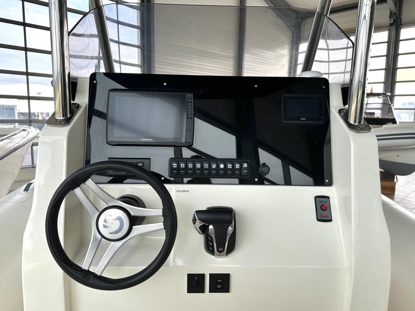 Côté console : un beau poste de pilotage protégé par un hard top, un espace s'ouvrant vers l'avant avec le WC, pouvant servir de zone de stockage, et une banquette très appréciable en navigation.