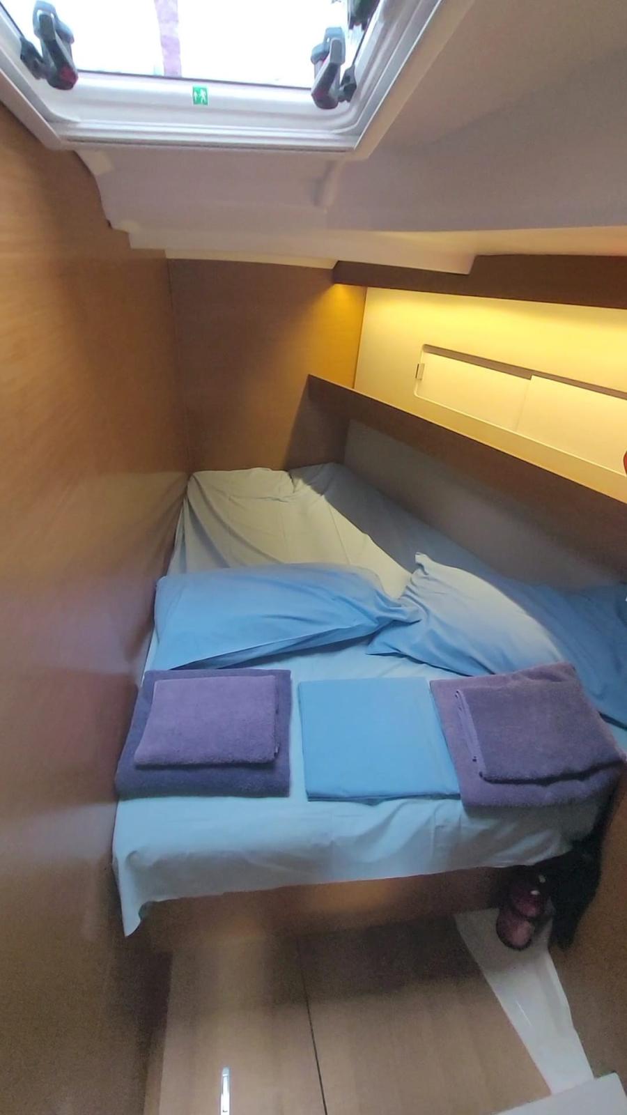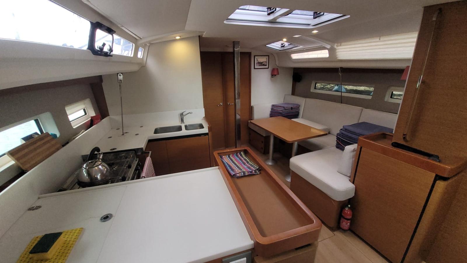 Propulseur d’étrave, annexe avec quille rigide et deux rames, gonfleur, petite ancre avec câble de 15 m, auvent, capote, ancre de secours avec câble de 50 m, manivelles de treuil, cordes (1x50m, 1x25m, 3x15m), chaise de marin, bouteille de gaz, table, douche extérieure, câble 220 avec chargeur de batterie, coussins de cockpit, chaudière, lazyjack, lazybag