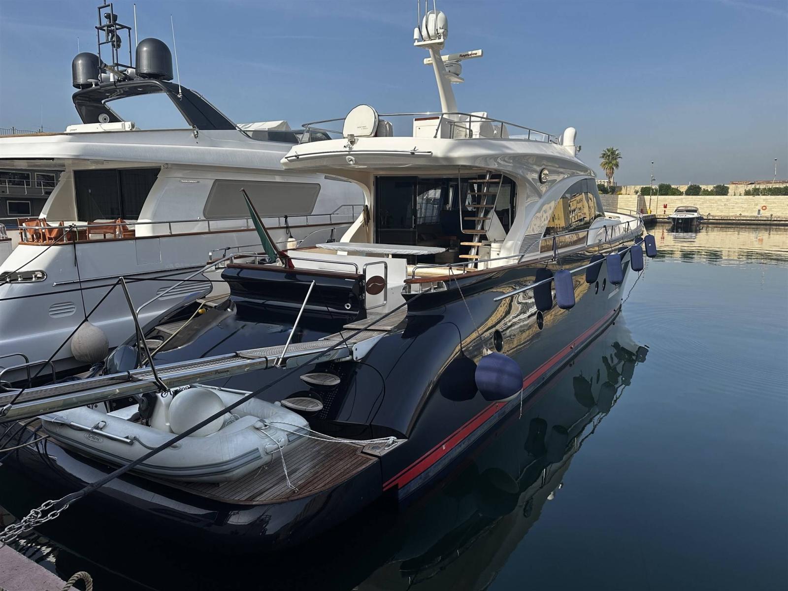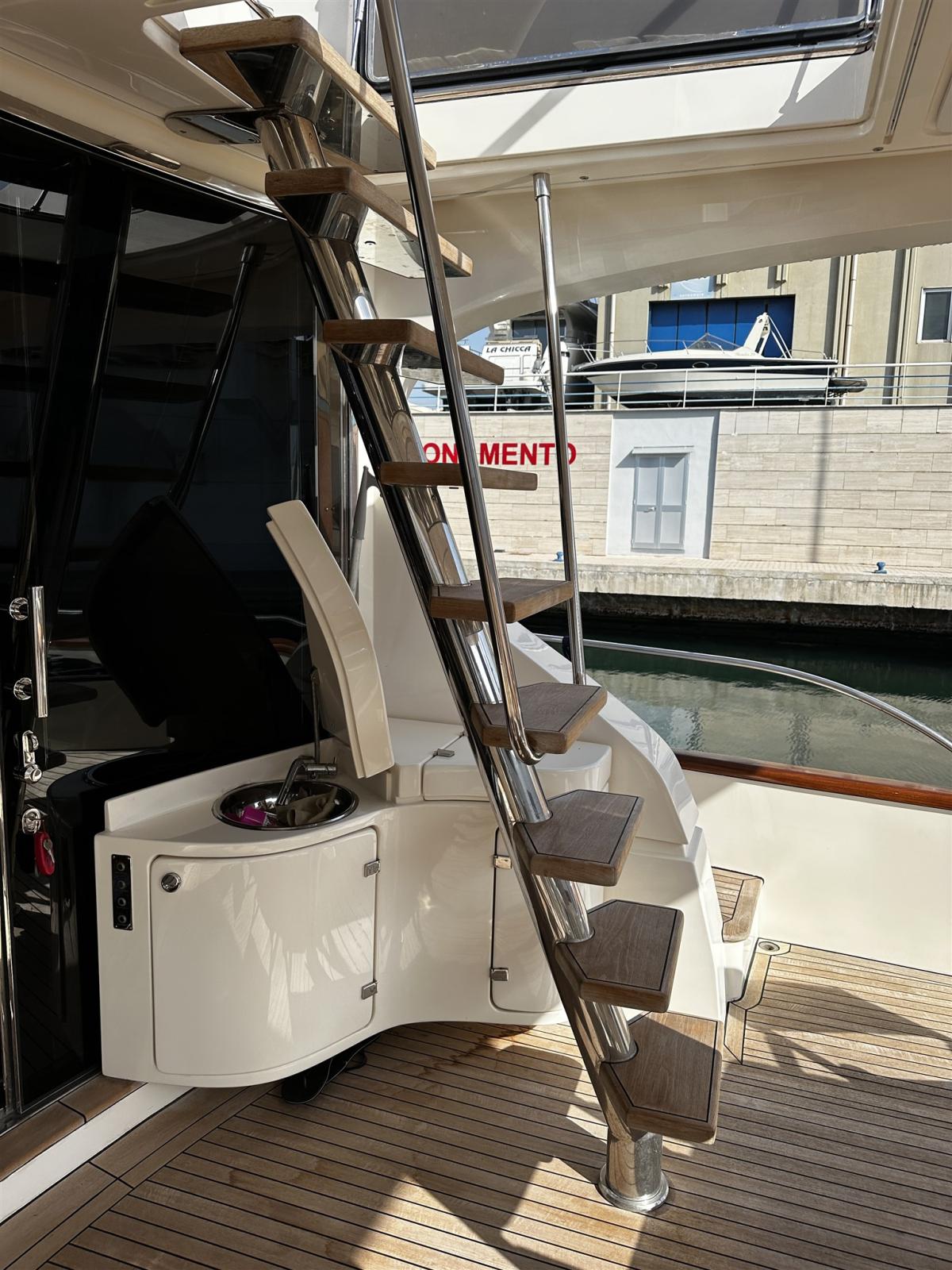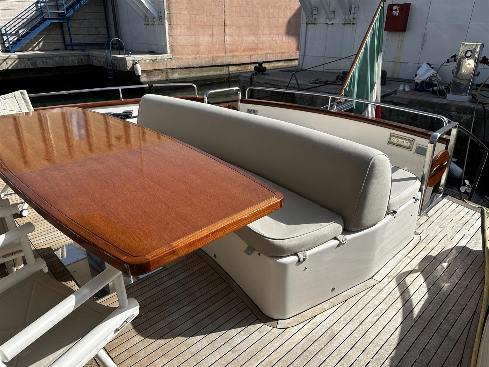 Alarme moteur, Alarme de pompe de cale, 2 Eau sous pression (Gianneschi), Radeau de sauvetage (2 grandi e uno piccolo), Batteries (12 nove 2024), Taquets pliants (solo poppa in pedana), Système de vidange (sala macchina), Passavant en teck, 3 Chargeur de batterie (Mastervolt quello grande nuovo 2024), Double barre à roue, Propulseur de poupe (Vetus), Propulseur d'étrave (Vetus 2400 Wat revisionato 2024), Phares fixes arrière, Phare de poursuite (Prua fly), Flaps hydrauliques, Garage à annexe (Da revisionare l'apertura), Extincteur(s) fixe(s), Compresseur de plongée (Doppia pomba 75000 VTU), Indicateurs de flaps, Lavage de chaine, Lavabo dans le cockpit, Éclairage de courtoisie, Passerelle (IDRAULICA), Plateforme arrière (Idraulica Opac Mare), Pompe de cale automatique, Pompe de cale manuelle, Porte latérale (Acciao Opac Mare), 2 Porte latérale (in cucina e salone elettriche), Cockpit en teck, Prise de quai, Connexion eau sous pression à quai, 2 Onduleur (uno e' per i generatori), Guindeau électrique (Lofrans), Echelle de bain (elettrica Opac Mare), Selles pour Annexe, table de cockpit (Teak verniciato), Table pliante de salon, Annexe (Aer Marine 2.40), Filières avec sortie latèrale, Corne, 2 Winch électrique (poppa), 2 Winch électrique arrière (Lofrans).