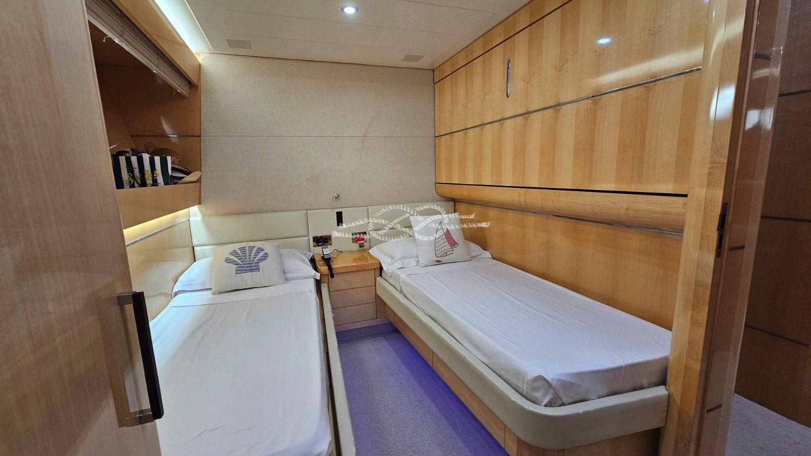 Cabine principale avec lit double, grandes armoires et salle de bain avec douche séparée - cabine VIP avec lit double et salle de bain avec douche séparée - cabine d’amis avec deux lits plats, troisième lit pliant et salle de bain avec douche séparée - cabine d’amis avec deux lits plats et salle de bain avec douche séparée.