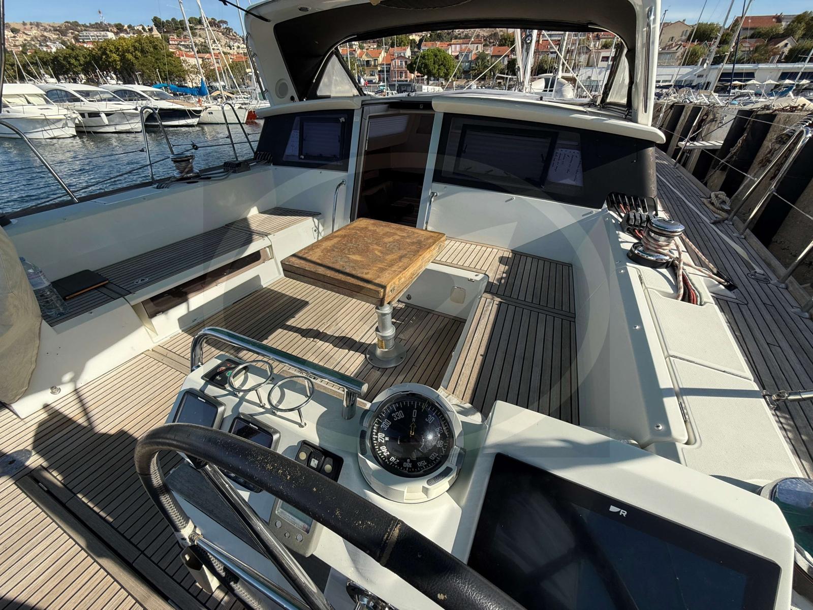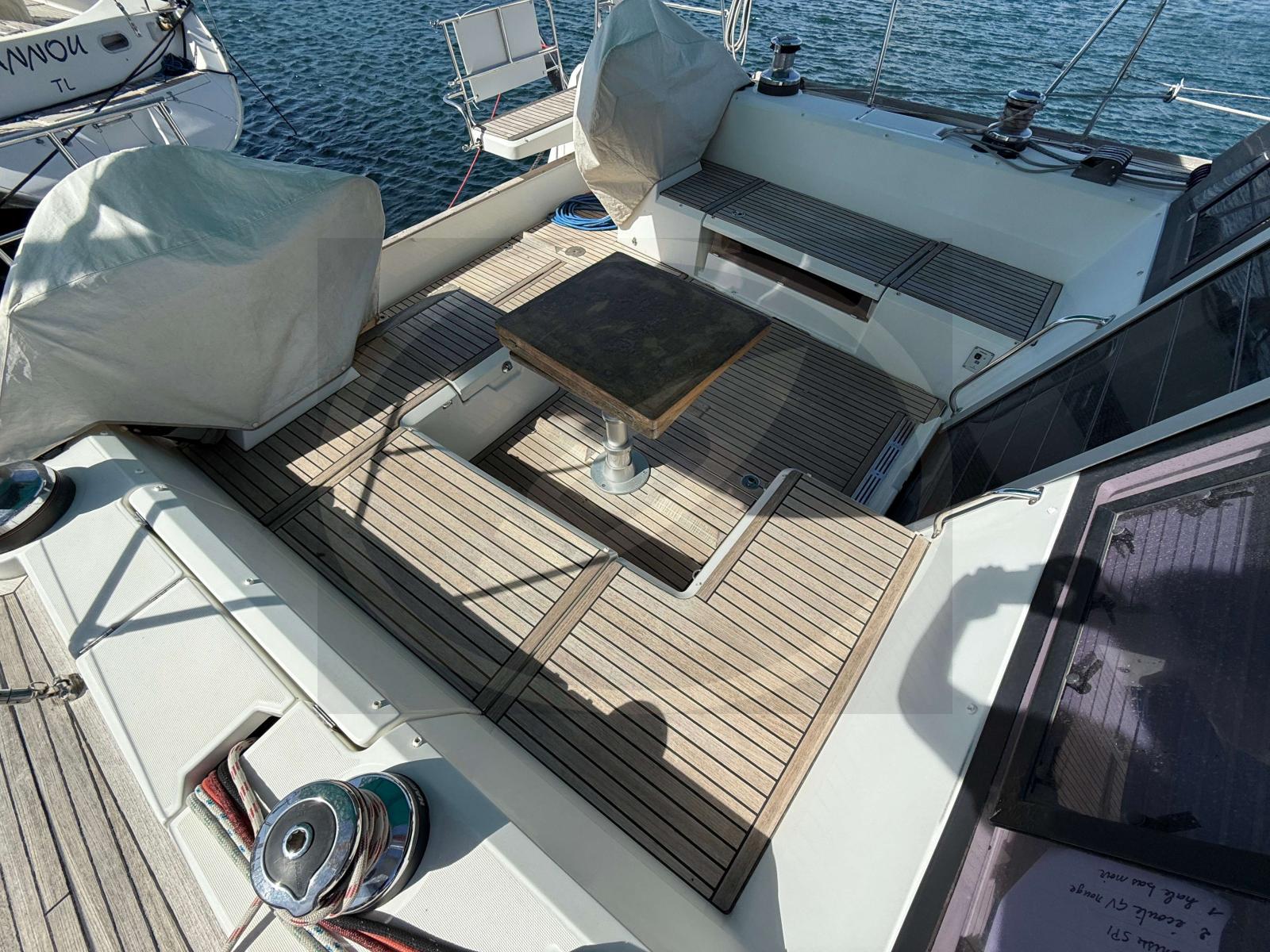 Cockpit teck (bon état) spacieux avec table teck (à revernir) et porte de descente électrique