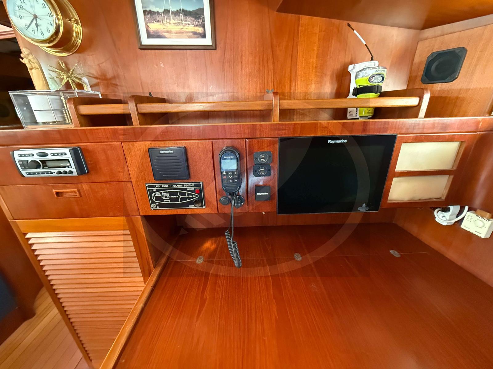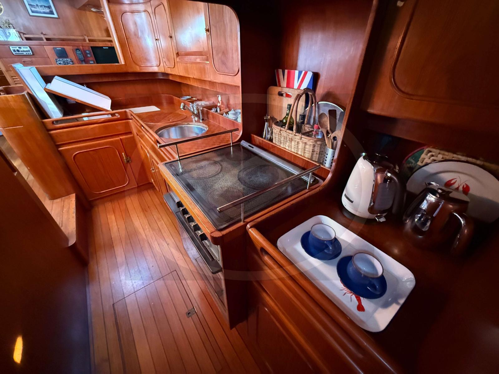 À l’intérieur, l’atmosphère raffinée se déploie autour de boiseries nobles et d’espaces baignés de lumière. L'aménagement, vaste et chaleureux, propose une suite propriétaire, deux cabines avant twin transformables et trois salles d’eau.