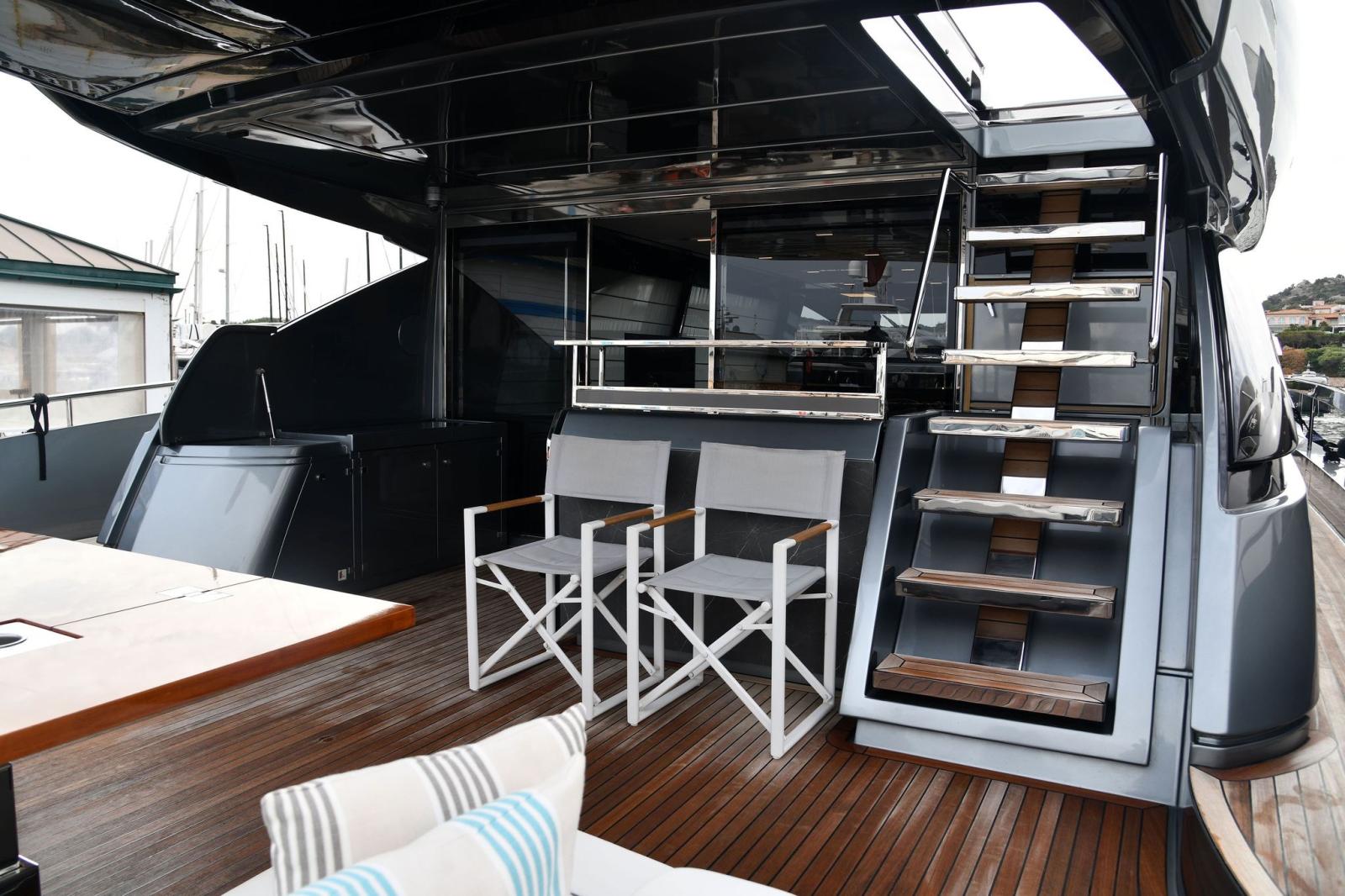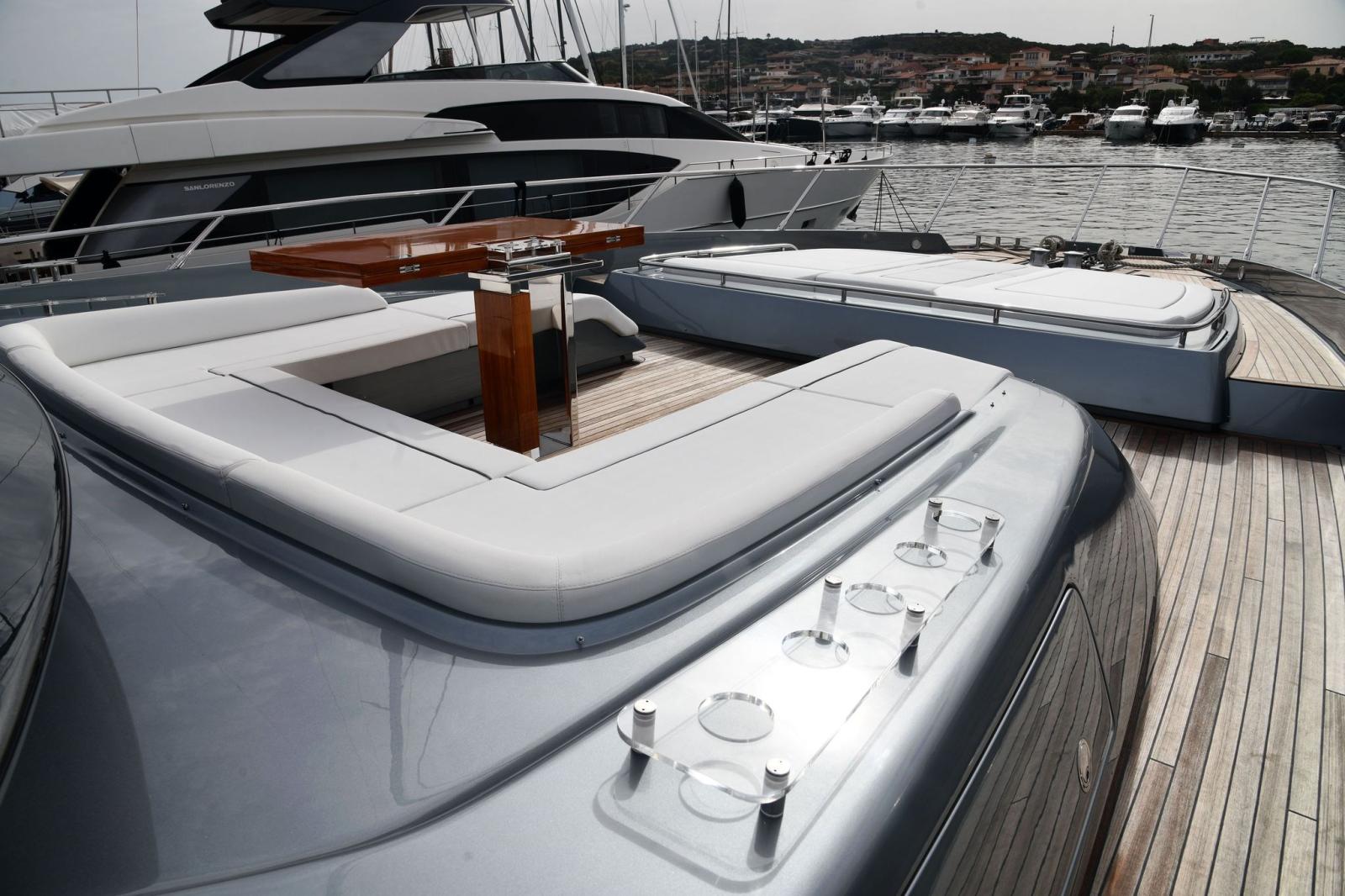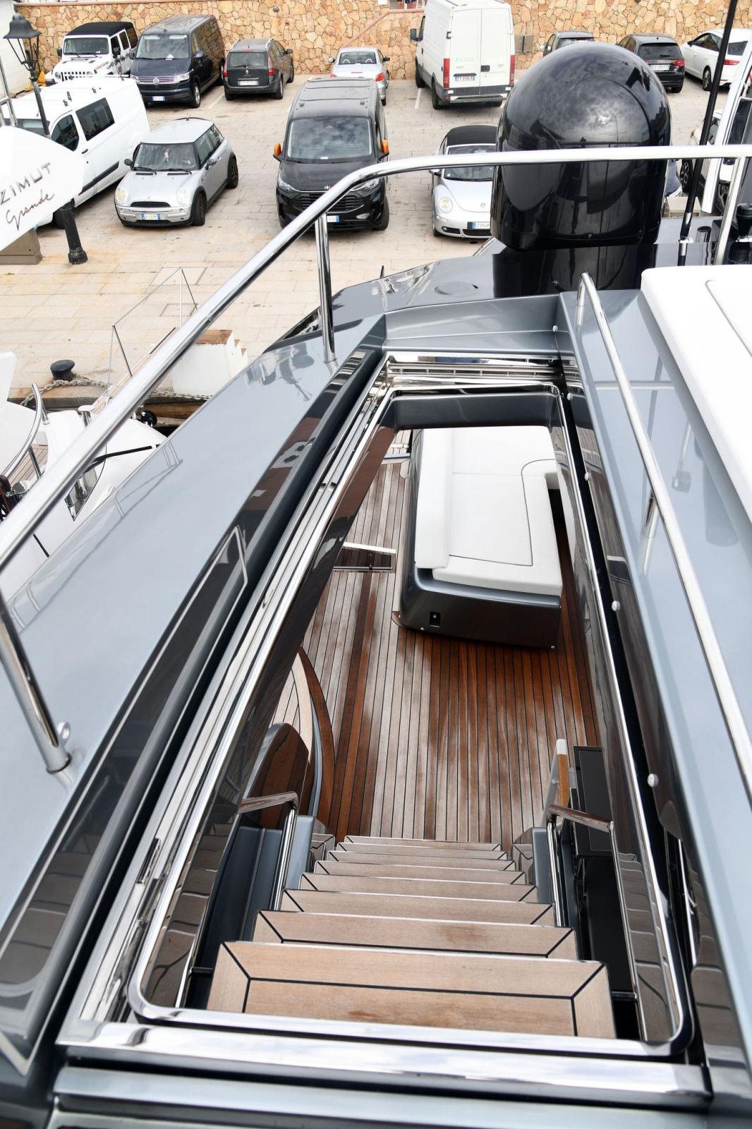 Eau sous pression, 2 Taquets pliants (da ormeggio addizionali), Filères, Filière, Douche de cockpit, Double barre à roue, Garage à annexe, Lavabo dans le cockpit, Spots sous-marins, Passerelle, Pompe de cale automatique, Prise de quai, Connexion eau sous pression à quai, Répétiteur électronique (simrad in crew dinette), Guindeau électrique, Echelle de bain, Stabilisateurs (di assetto), table de cockpit, Corne.