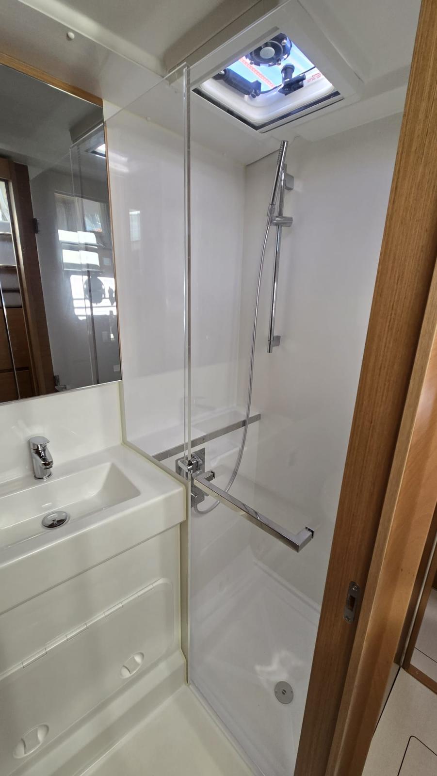 Equipmement: Pack Fleet Up (dont balcons avant et filières, aménagement pointe avant babord, couchette double dans le carré, ventilateurs dans carré et cabines, réserve eau douce supplémentaire 300L, matelas bleus dans les cabines), Sellerie du carré PVC Weiss, Pulse Line, Winch électrique de manoeuvre tribord, Lazy-bag, 2ème siège barreur babord, Escalier d'accès au roof, Bossoirs inox et panneaux solaires 3*300W, Convertisseur 12-220 V (2KVA), Ecran Multifonction GARMIN 7 Pouces sur console de barre tribord, Pilote auto Garmin et télécommande de pilote , AIS 800 Garmin et VHF Garmin 315, Pompe de lavage de pont eau de mer - eau douce, Meuble haut de cuisine tribord, Meuble de rangement additionne babord, Coussins de cockpit gris et Bain de soleil de cokcpit arrière , Pack audio Fusion carré et cockpit, Pouf additionnel, Code 0 Stormlite + Bande UV sur emmagasineur, Fermeture arrière de cockpit, Taquets d'amarrage additionnels étraves.