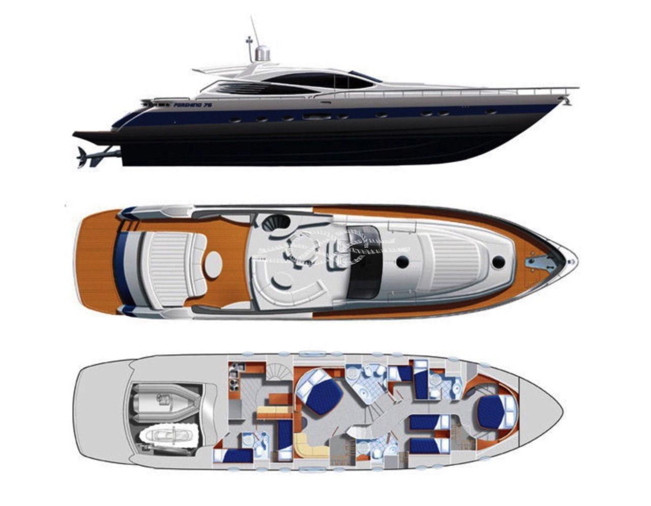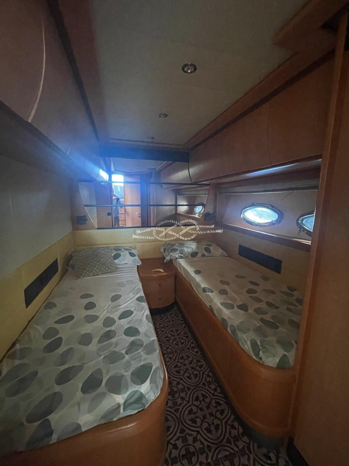 Cabine principale avec lit double, dressing et salle de bain - Cabine VIP avec lit double et salle de bain - Cabine d’invités avec deux lits au sol - Cabine d’invités avec deux lits croisés - Salle de bain pour les invités.