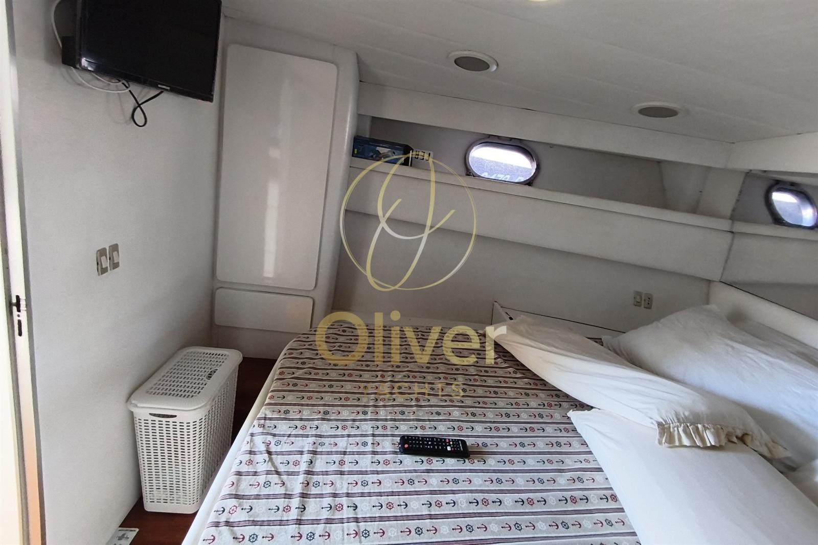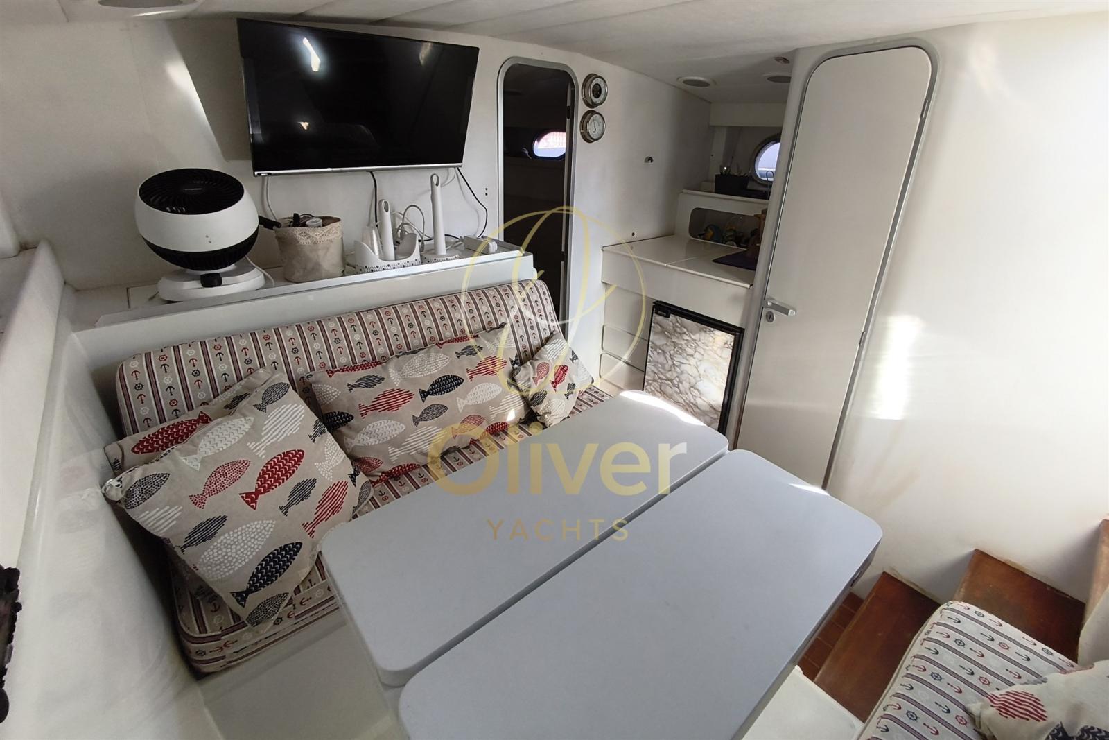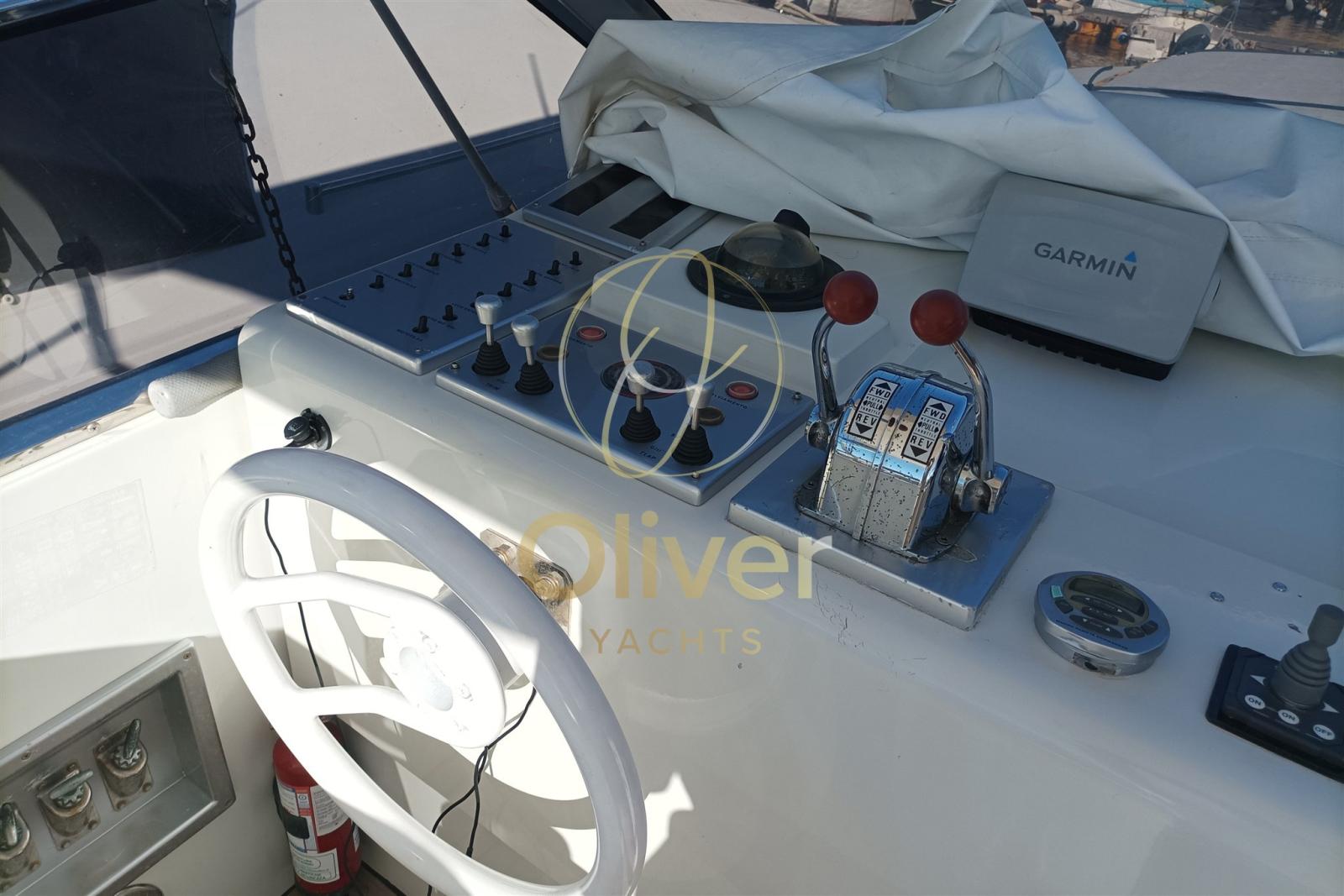 L’équipement technique comprend un GPS/traceur Garmin, un sondeur, une VHF, un onduleur et un système TV/stéréo, tandis que l’aménagement extérieur, agrémenté de grands coussins de bronzage en teck et d’un cockpit, invite à la détente et à la convivialité.
