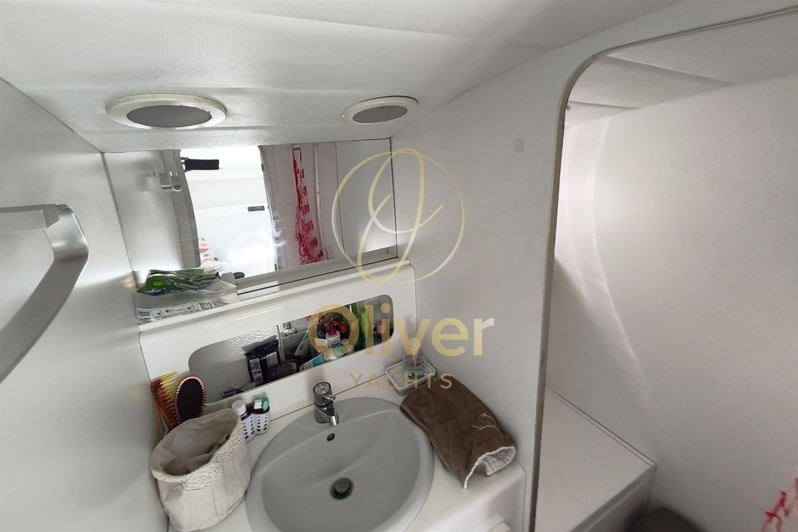 La salle de bain séparée, avec lavabo, WC marin et douche, est spacieuse et bien finie pour un bateau de cette catégorie.