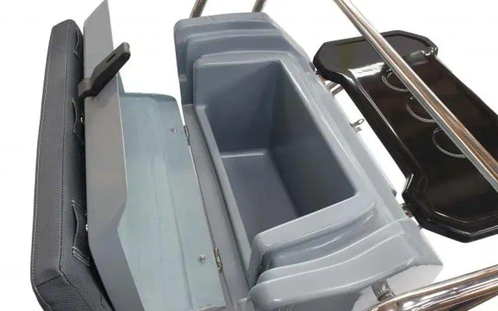 console L avec grand coffre avant, siège pilote L avec double coffre et table basculante, poignée de protage, taquet rétractable, gonfleur, réservoir 100 Litres avec jauge, échelle de bain