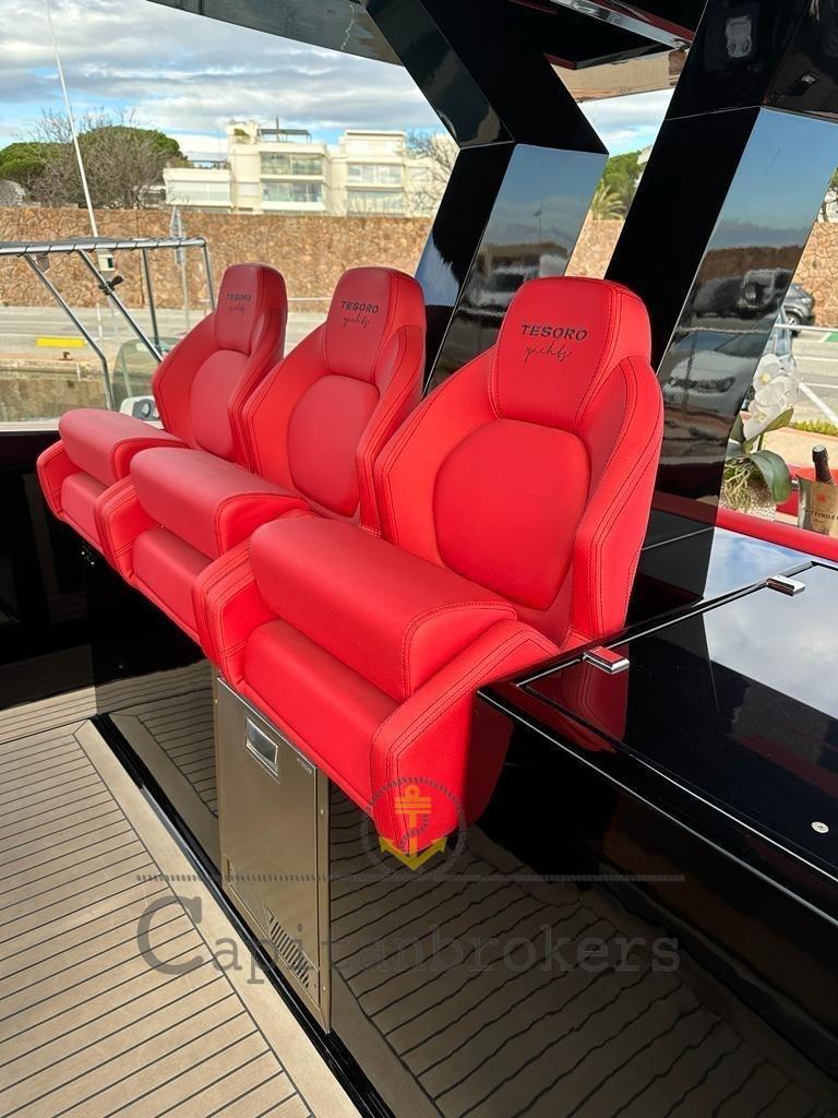 Feux LED Hardtop, connexion 12V et USB, sellerie intérieure, extérieure et du siège du pilote de couleur rouge, housses, coque et rouf avec peinture noire, manettes des gaz électroniques au mercure.