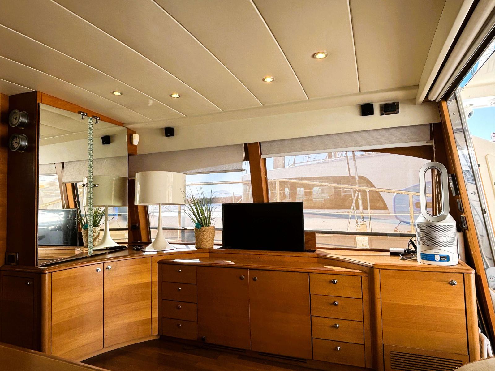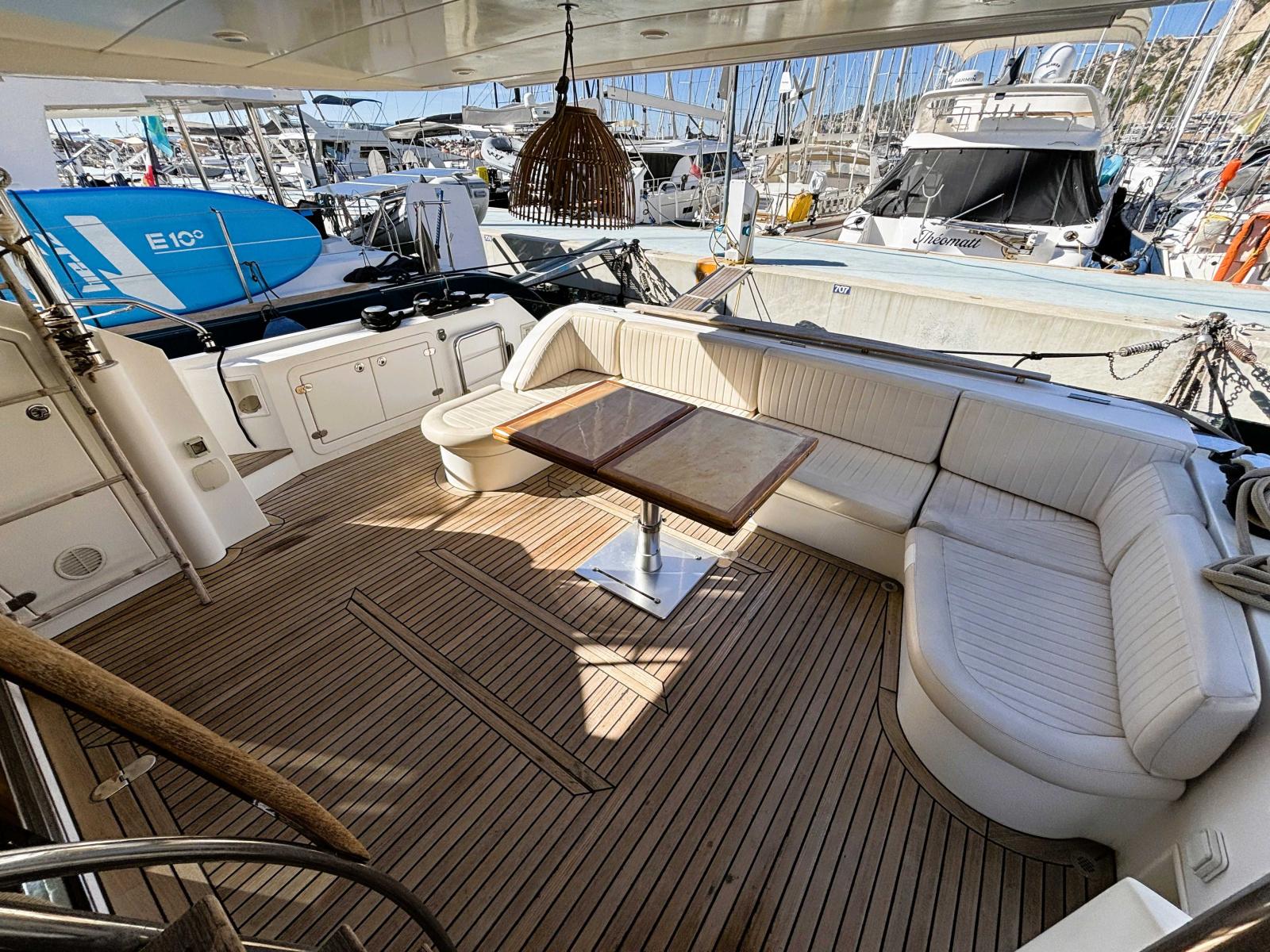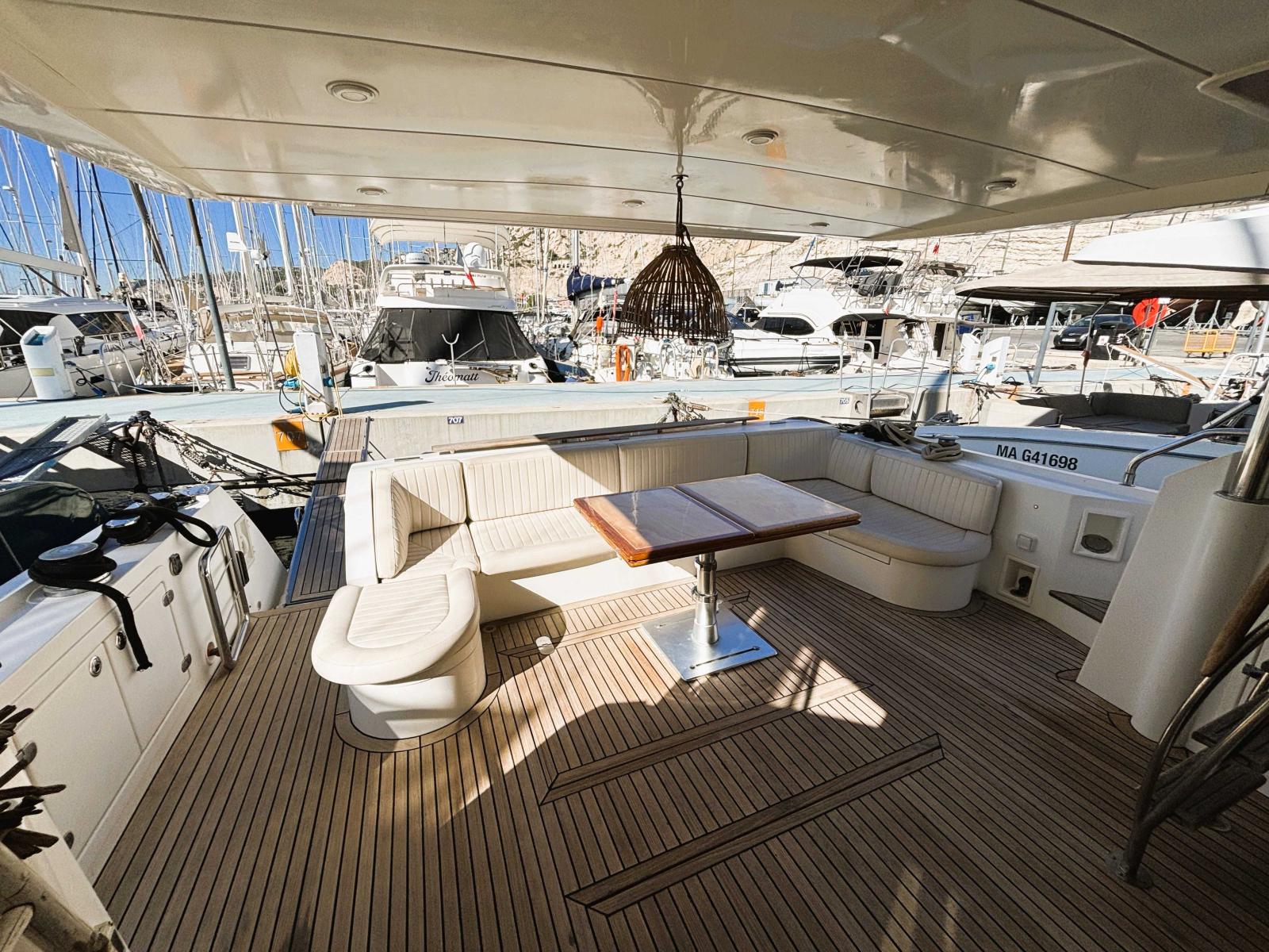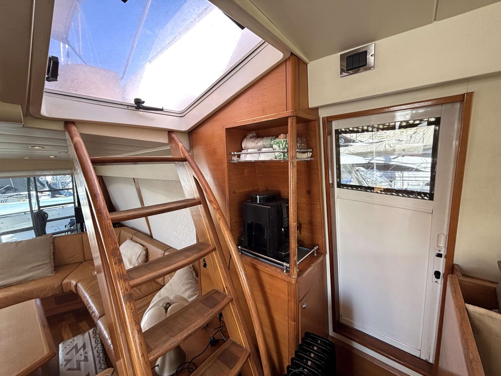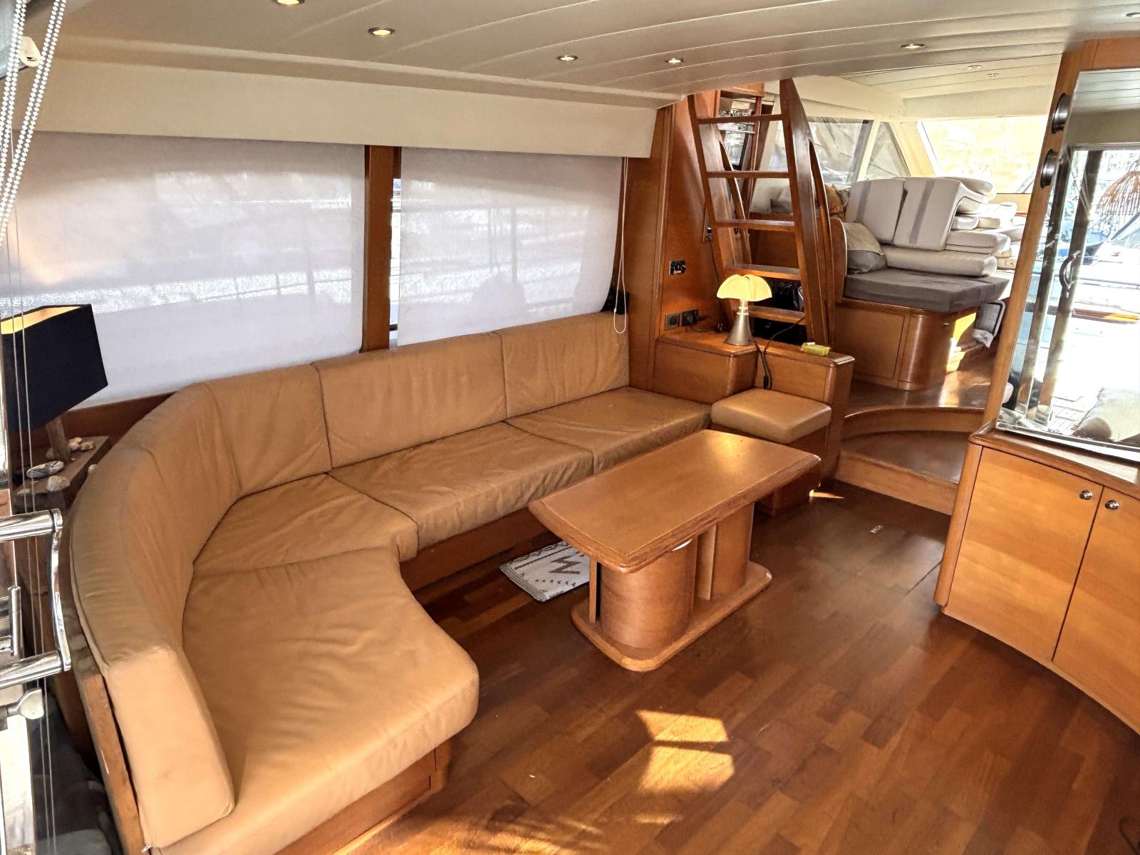 Le fly est accessible par l'échelle dans le cockpit ou bien par l'escalier dans le salon. Il dispose d'un grand carré avec banquette en U et une grande table repas. Un coin cuisine d'été avec réfrigérateur, planche et point d'eau.