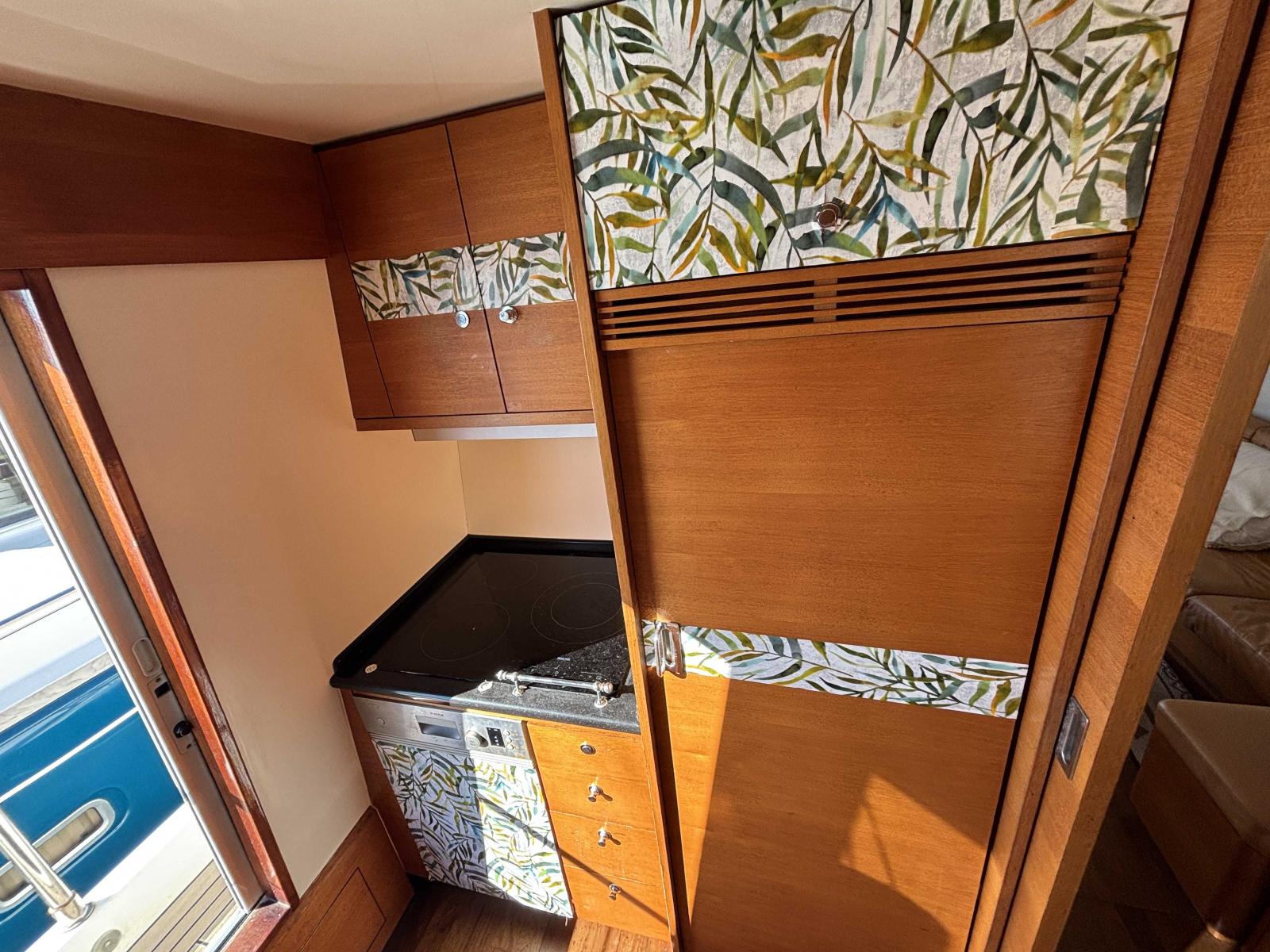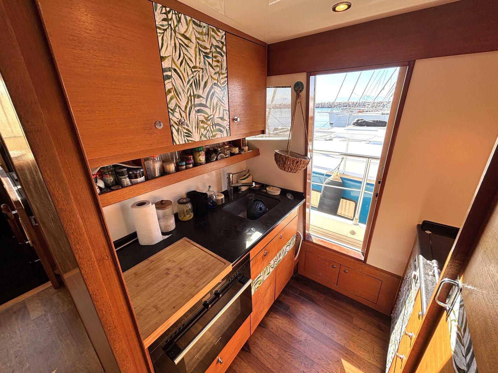 Plus en avant se trouve la cuisine entièrement équipée sur tribord avec une porte de donnant sur le passavant.