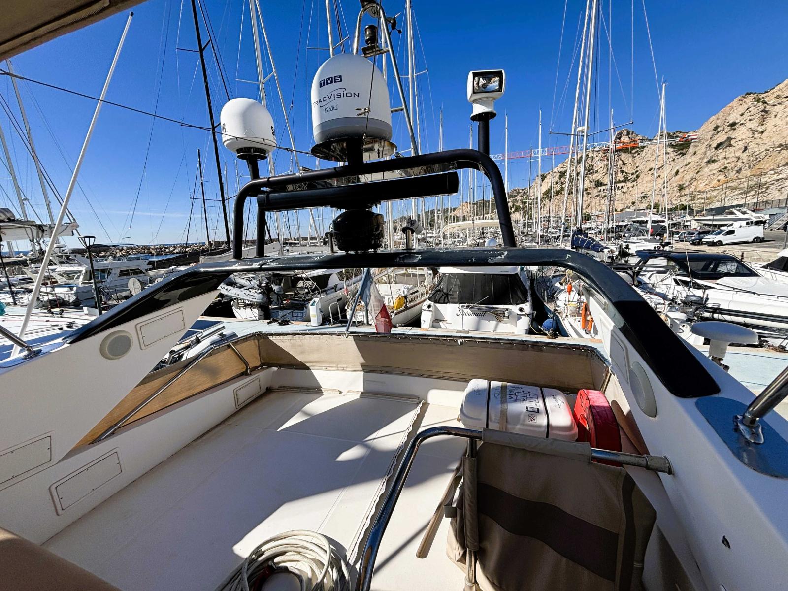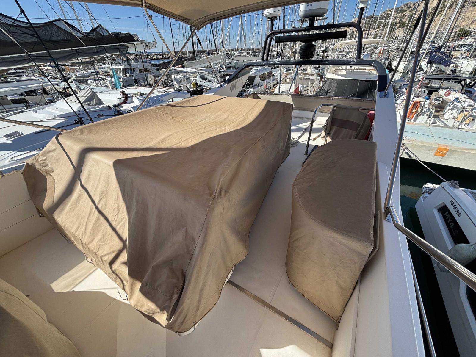 Grand bain de soleil à l'arrièredu fly, poste de pilotage sur la partie avant.