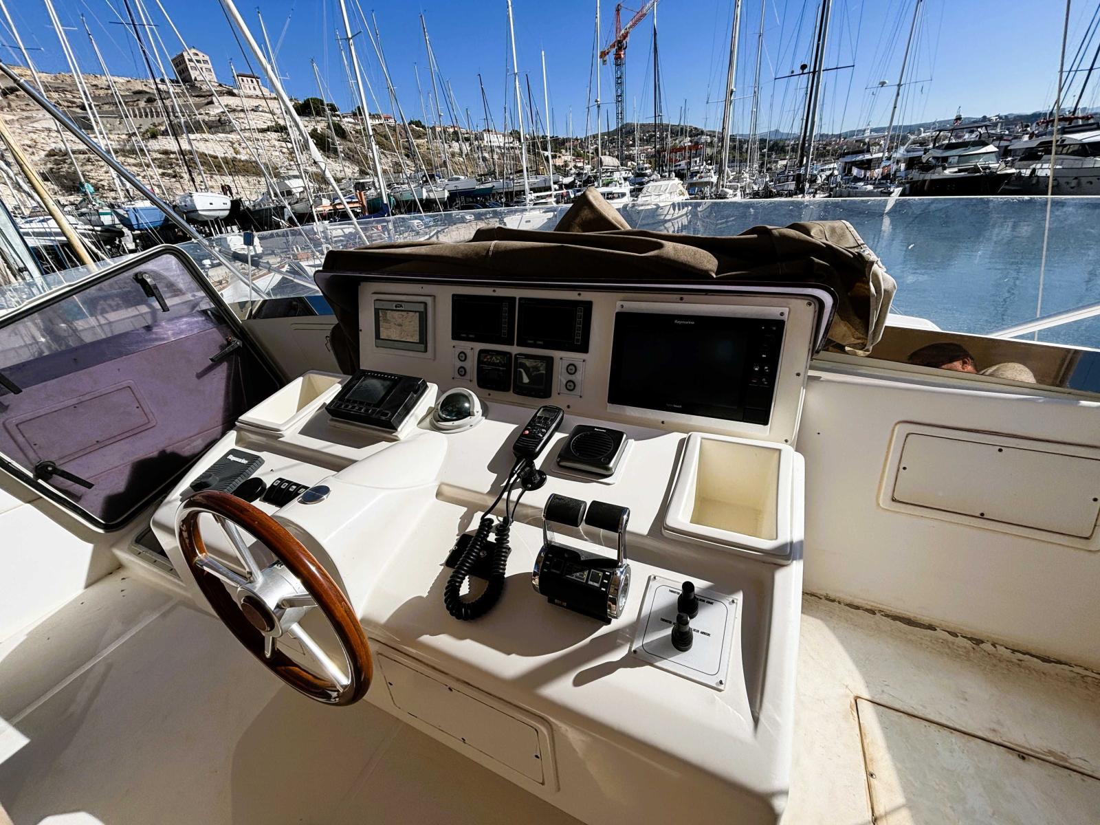 Le poste de pilotage est très complet avec deux écrans GPS Raymarine, pilote, radar, navtex, girouette anémomètre, tridata, commande de dessalinisateur, gestionnaires d'énergie, commande générateur et écran de tactile de contrôle etc ...