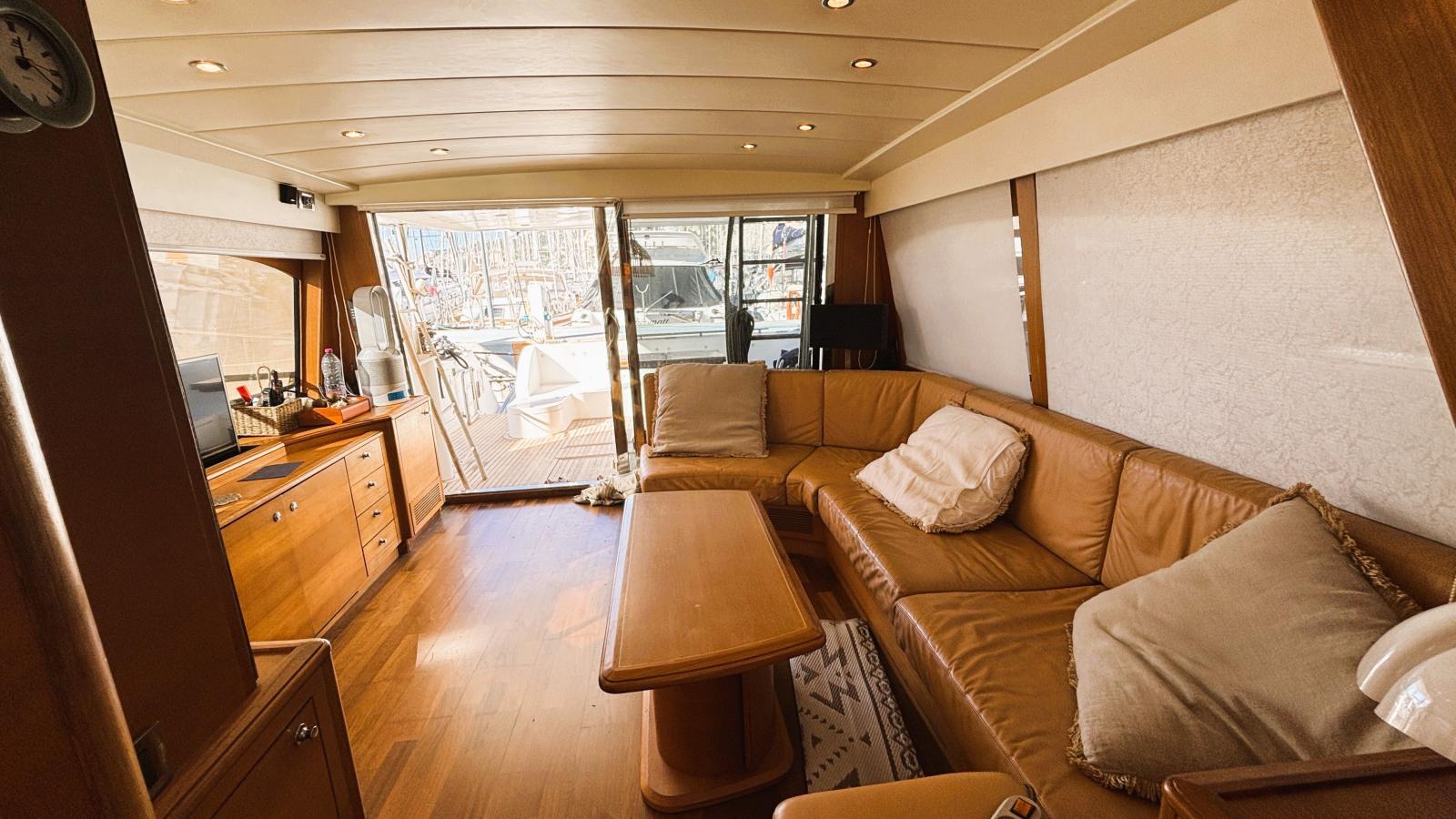 Pour l'intérieur, grand coin salon avec d'angle canapé en cuir, table basse et tabourets. Sur tribord, mobilier avec machine à glace et TV LCD.