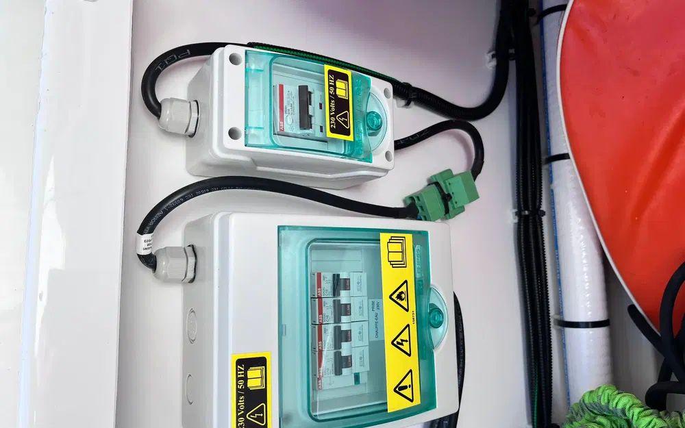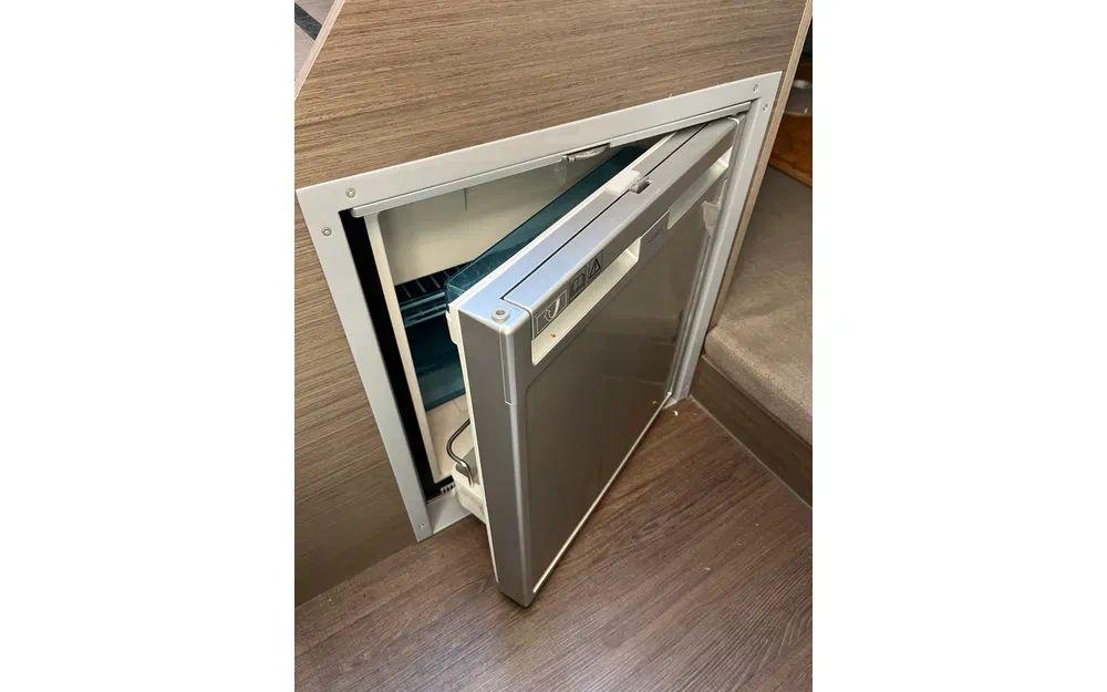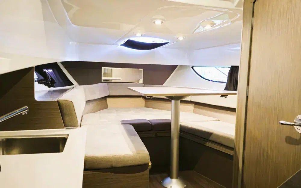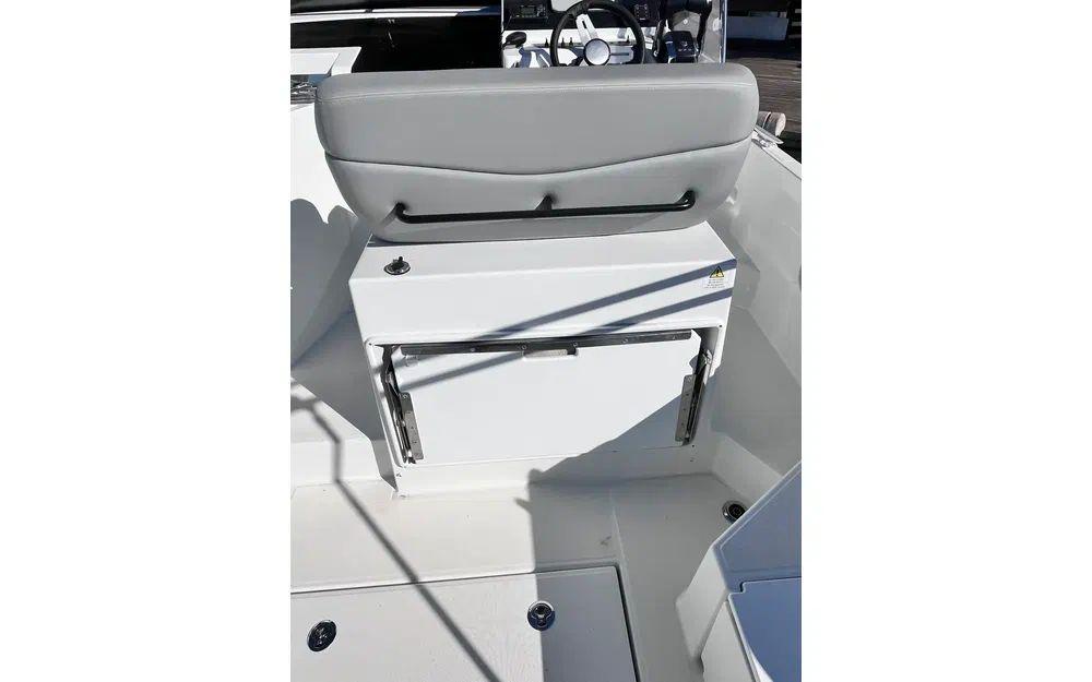 Côté équipement, on est sur du tout confort : réfrigérateur, circuit 220V et 12V, chargeur, propulseur d’étrave pour les manœuvres de pro, guindeau électrique pour l’ancre, sondeur, GPS, compas... Même vos cannes à pêche ont leur porte attitré. C’est simple, il ne manque que votre glacière remplie !