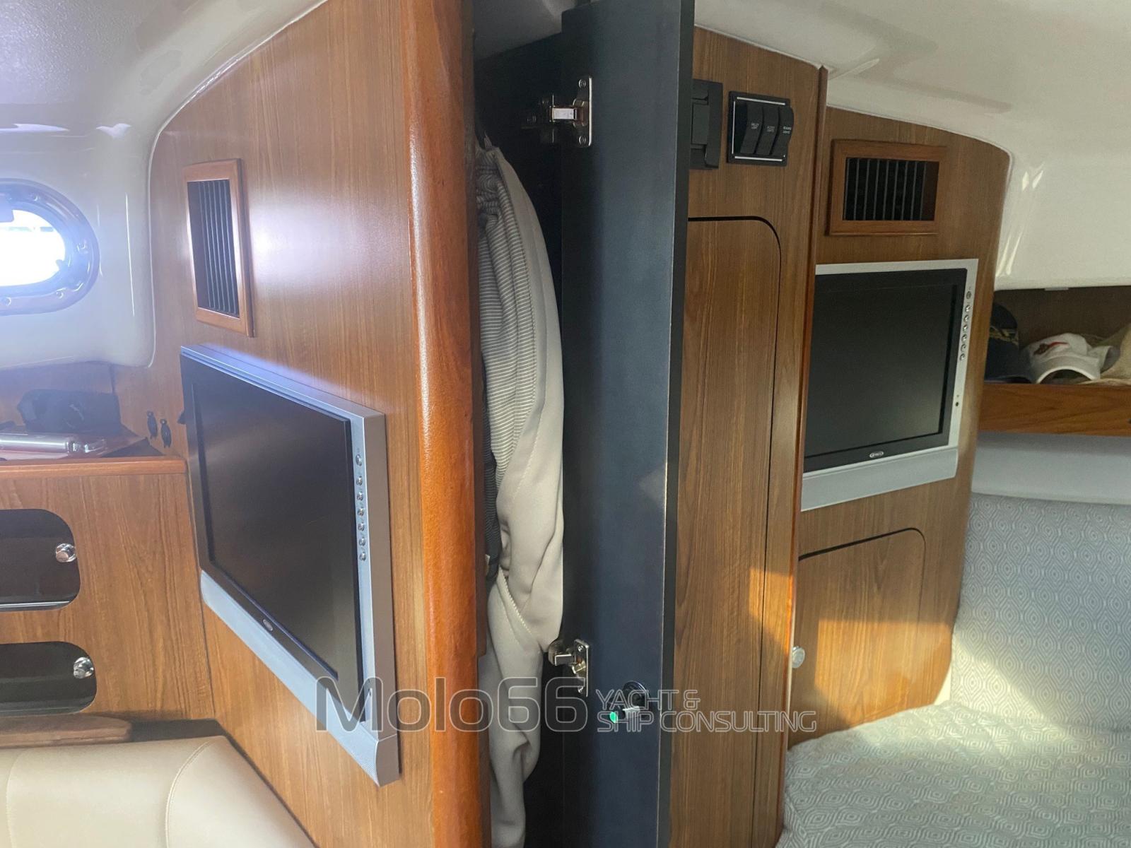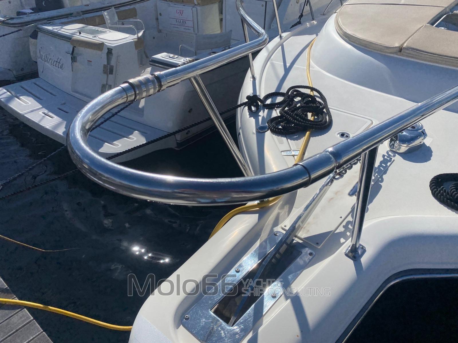 Alarme gaz (monossido di carbonio), Alarme moteur, Alarme de pompe de cale, Eau sous pression, Batteries (n° 7), Câble d’alimentation à quai, Douche de cockpit (calda/fredda), Propulseur d'étrave (5.4 hp), Phares fixes arrière, Phare de poursuite, Flaps électriques (Lenco), Hard top, Extincteur(s) fixe(s), Indicateurs de flaps, Lavage de chaine, Lavabo dans le cockpit, Éclairage de courtoisie, Panneau solaire, Défenses, Pompe de cale automatique (n° 3 - 2 da 1500 lth e1 da 1100 lth), Pompe de Lavage du Pont, Prise de quai, Onduleur, Guindeau électrique, Echelle de bain, table de cockpit, Corne.