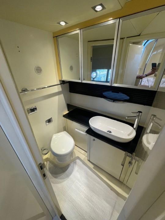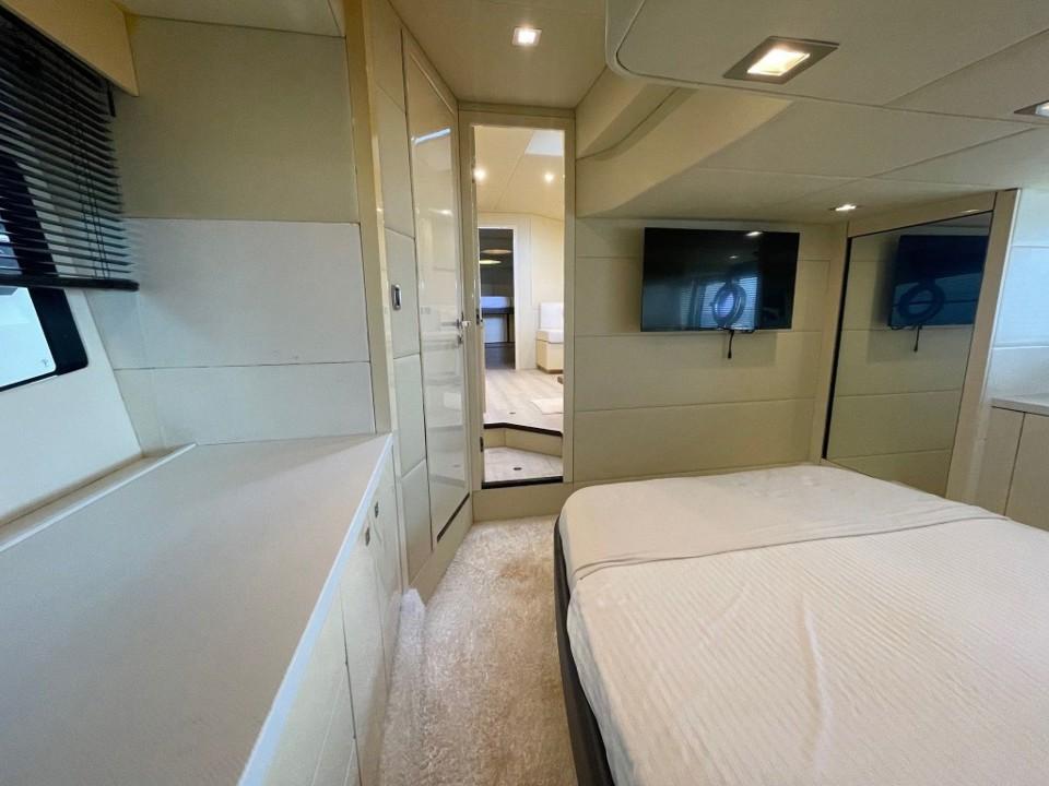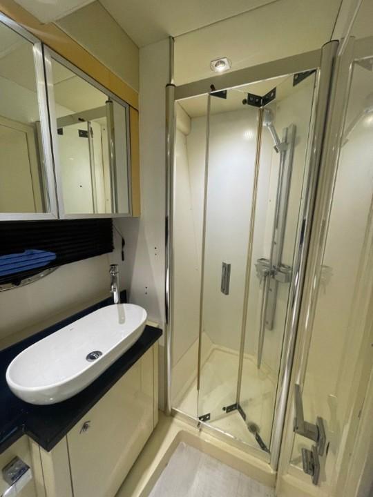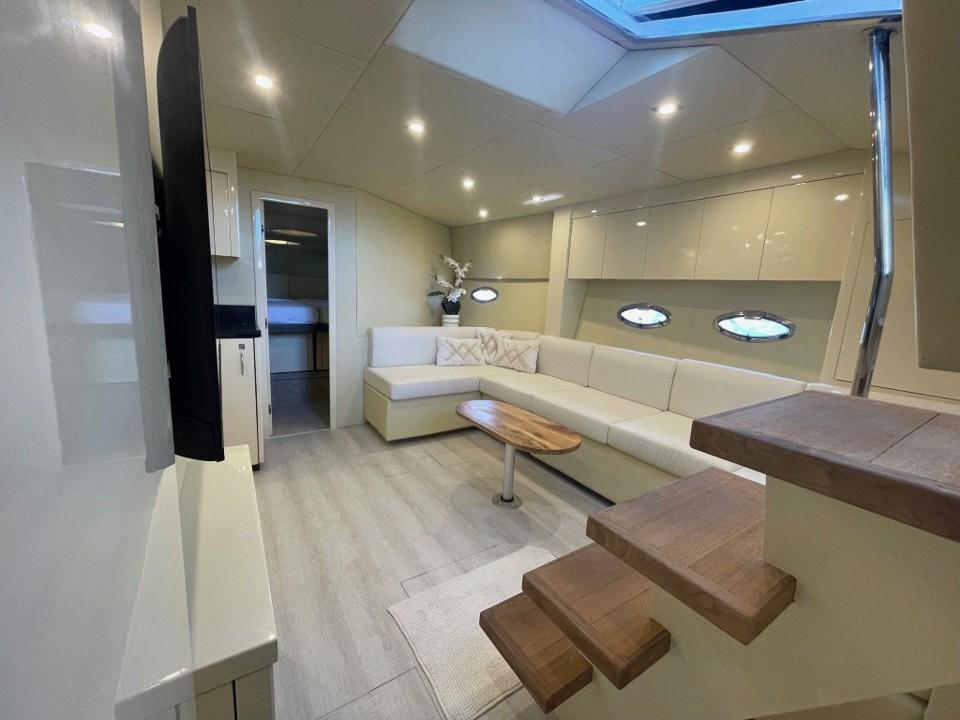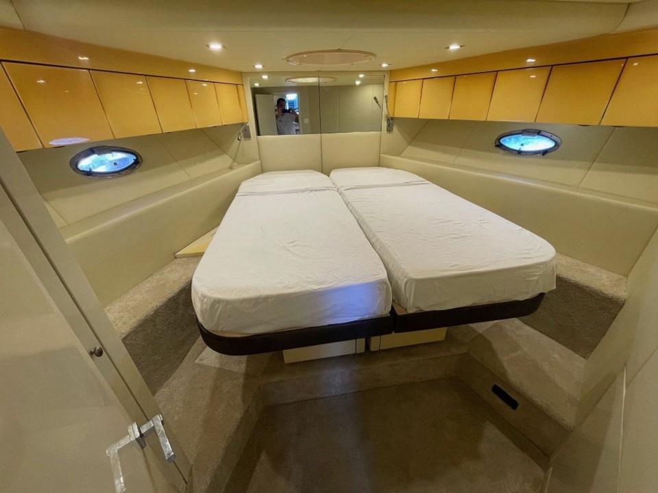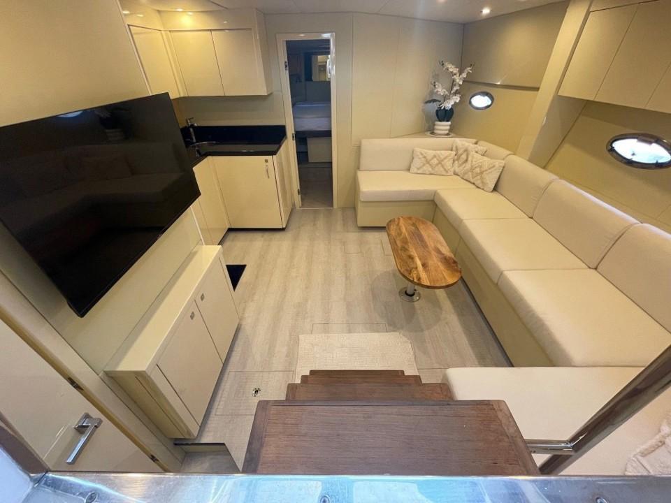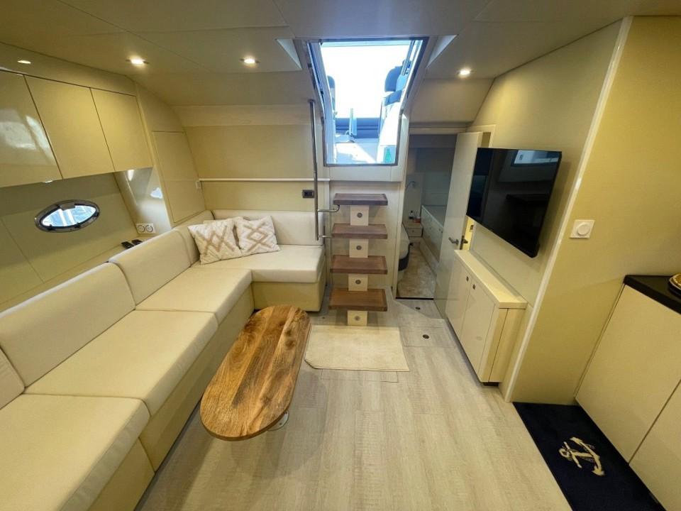 L’intérieur abrite un large salon avec TV et une cuisine équipée. L'hébergement se compose d’une cabine arrière-propriétaire et d’une cabine VIP avant avec un lit double séparable en deux couchettes. La salle d’eau avant a été supprimée pour agrandir le salon. Nous en retrouvons une seule, à double accès, avec douche séparée et WC électrique.