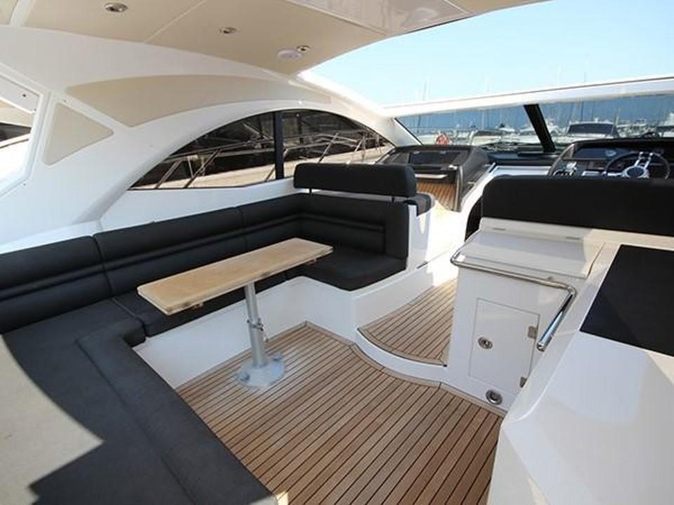 Le cockpit extérieur offre des espaces généreux. Il propose un bain de soleil fixe, un coin repas et une cuisine d’été. Le poste de pilotage, tout aussi sophistiqué, permet au pilote et au passager d'admirer pleinement l'horizon. Une plateforme de bain hydraulique facilite l’accès au bain et au garage à annexe.