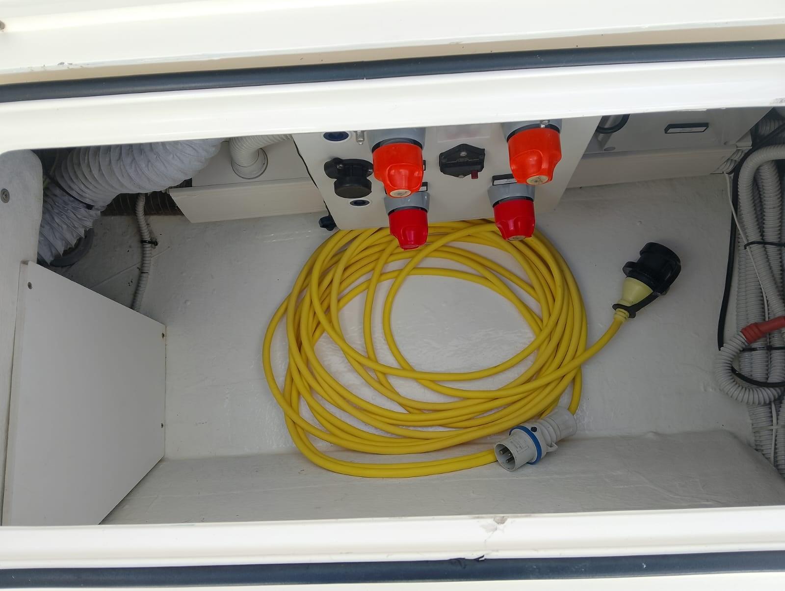 Alarme moteur, Alarme de pompe de cale, Alternateur, Eau sous pression, Câble d’alimentation à quai, Douche de cockpit, Lavabo dans le cockpit, Éclairage de courtoisie, Pompe de cale manuelle, Cockpit en teck, Prise de quai, Rollbar, Guindeau électrique, table de cockpit, Corne.