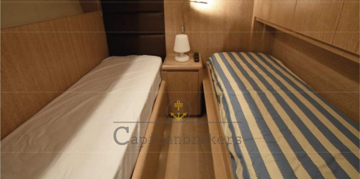 Cabine principale pleine largeur au milieu du navire avec salle de bain attenante, cabine d’invités VIP avec lit double et salle de bain privée, cabine d’invités VIP avec lit double, cabine d’invités avec lits plats avec salle de bain, cabine d’équipage à l’avant avec salle de bain.