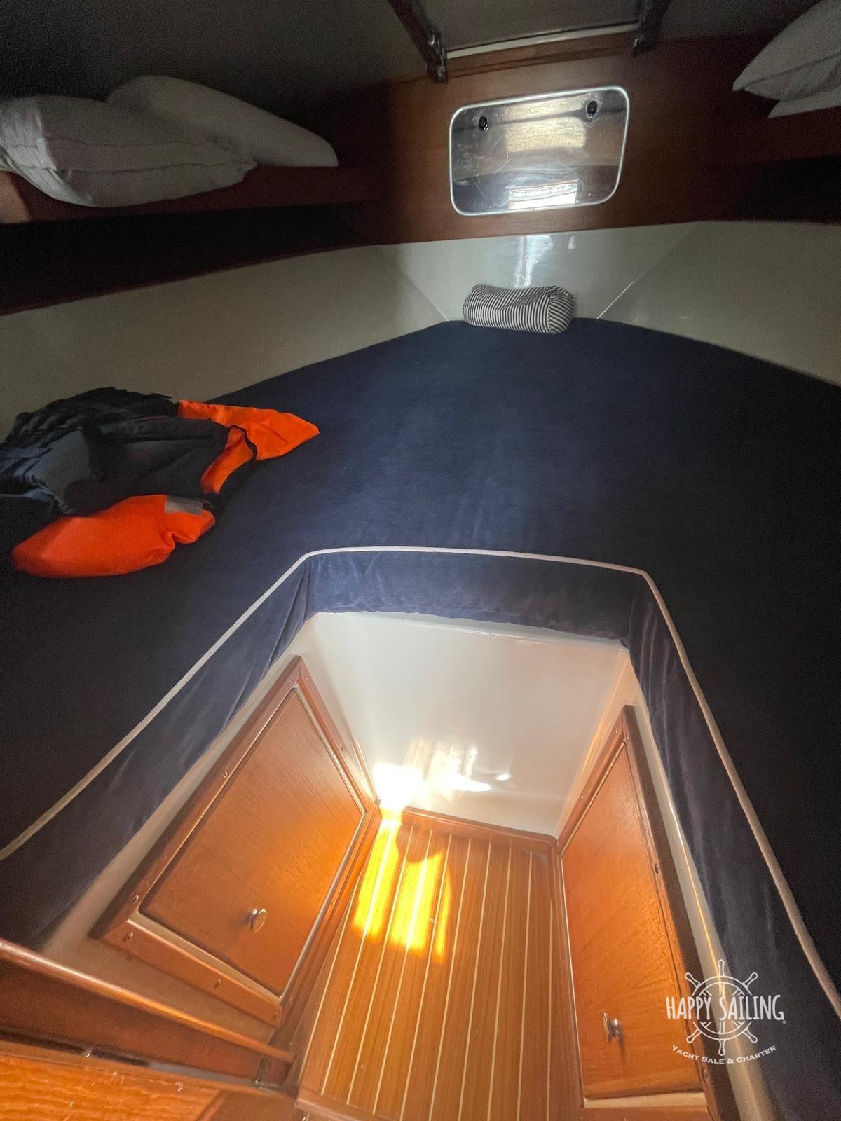 En entrant dans le bateau, il y a, sur la gauche, la salle de bain avec hublot avec lavabo, toilettes électriques et douche. Plus loin, dans la dinette, il y a un canapé double avec une table à manger en bois à droite et un long canapé qui peut être utilisé comme lit à gauche