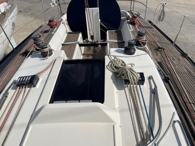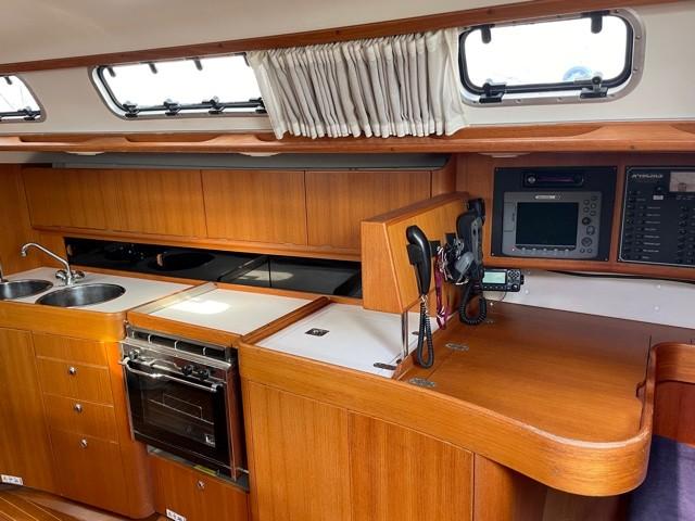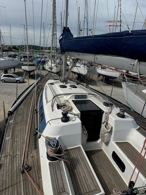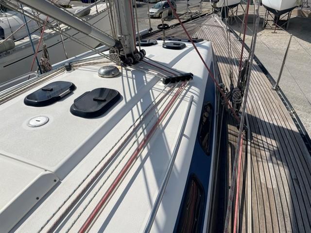 Portique profilé(démontable) avec bossoirs pour soulever l’annexe, Panneaux solaires 200w, Taud soleil, Capote de roof, Barre à roue avec habillage cuir + housse bleu marine, Table de cockpit.
