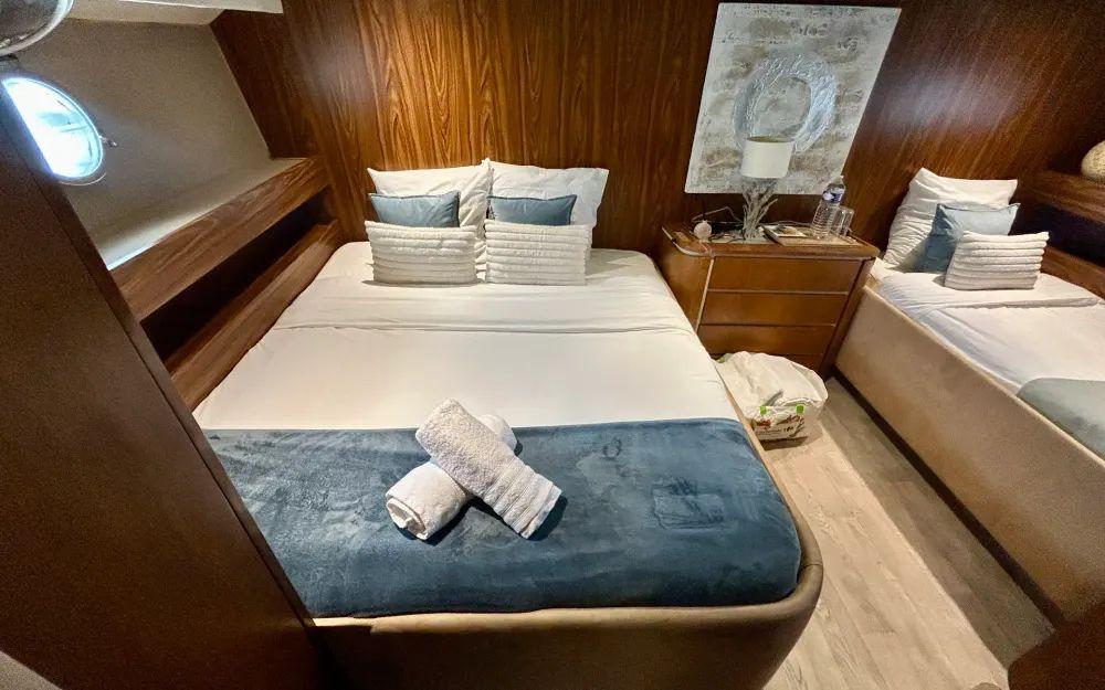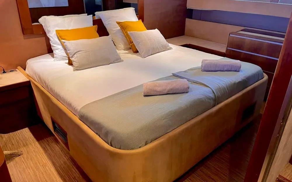 À bord, le charme agit immédiatement. Les volumes sont généreux, baignés d’une lumière douce.Quatre cabines, chacune dotée de sa salle d’eau et de ses toilettes, offrent neuf couchages confortables, mêlant intimité et hospitalité.Le carré, vaste et chaleureux, invite à la détente ; la cuisine, parfaitement équipée, prolonge les plaisirs simples et raffinés de la vie en mer.Sur le pont supérieur, le regard se perd vers l’horizon — un espace rare, propice aux dîners d’été, aux conversations à la tombée du jour, aux silences partagés.