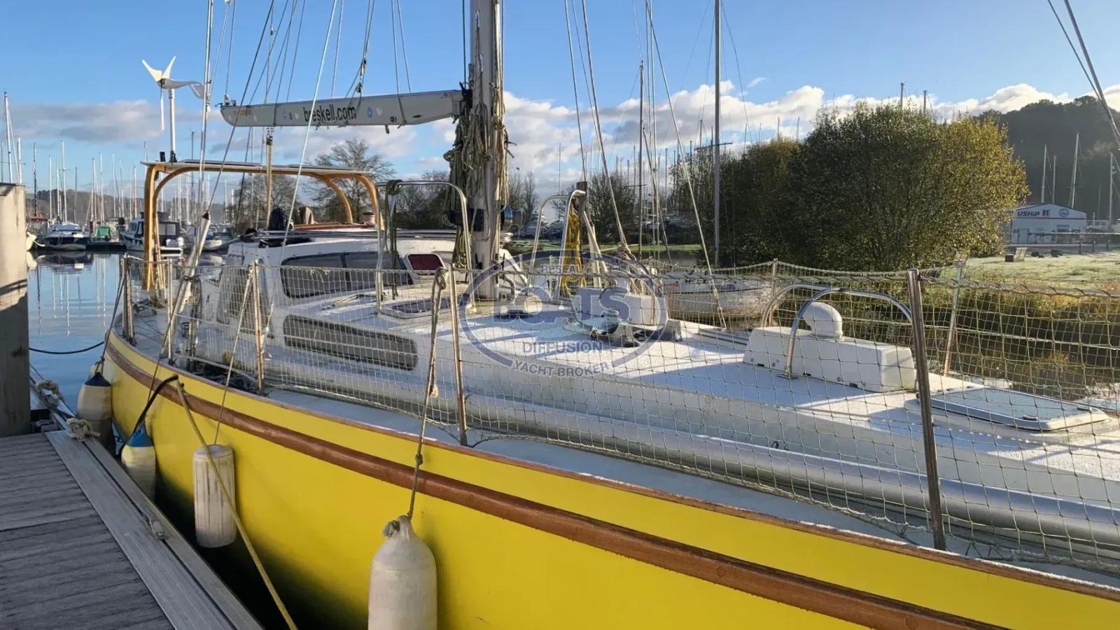 Dimensions | Longueur : 15,80 m (51’) – Largeur : 4,60 m – Tirant d’eau : 1,20 m / 3,05 m (dérive relevable) | | Construction | Coque : bois moulé acajou stratifié époxy (West System) – Pont refait en 2005–2009 (3 couches : CP marine + cèdre rouge + CP marine, stratifié fibre/époxy) | | Isolation | Intégrale : panneaux polystyrène bleu 60 mm + mousse polyuréthane (confort thermique optimal) | | Motorisation | Perkins 4.236 84 ch (entièrement refait en 2022, 300 h) – Vitesse de croisière : 6–7 nds à 1 700 tr/min | | Autonomie | 2 réservoirs gasoil (300 L) – 2 réservoirs eau douce (1 200 L) – Autonomie énergétique : 6 panneaux solaires (400 W) + éolienne 400 W | | Manœuvrabilité | Dérive relevable (accès aux eaux peu profondes) – Propulseur d’étrave Lewmar 5,4 ch – Convoyage en solo possible | | Performances | Moyenne : 10–12 nds sur 24 h (pointes supérieures) – Régulateur d’allure ARIES + pilote automatique |