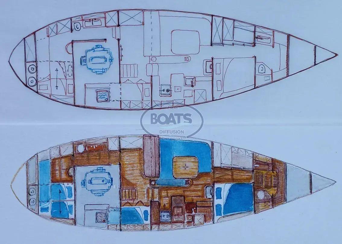 Ce voilier, c'est l'œuvre d'une vie, construite en 1986 par son unique propriétaire, un maître-charpentier passionné. Fruit d'un savoir-faire exceptionnel, sa coque en bois moulé acajou stratifié époxy témoigne d'une robustesse et d'une résistance à toute épreuve, maintes fois prouvées au cours de ses 50 000 milles nautiques dont un passage en arctique. À l'intérieur, le même dévouement se retrouve dans chaque détail : des boiseries massives magnifiquement ouvragées et des peintures d'artistes confèrent une atmosphère chaleureuse et raffinée. C'est avec un profond regret que son créateur se sépare de ce compagnon de voyages, de vie et d'aventures, espérant ardemment que le futur acquéreur poursuivra la formidable histoire de ce bateau.