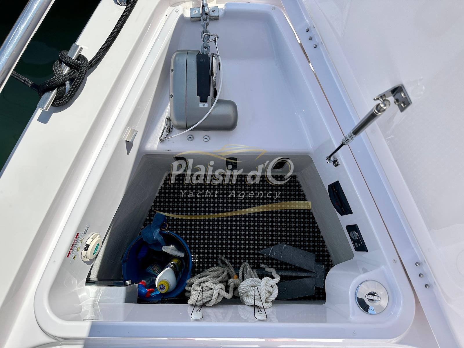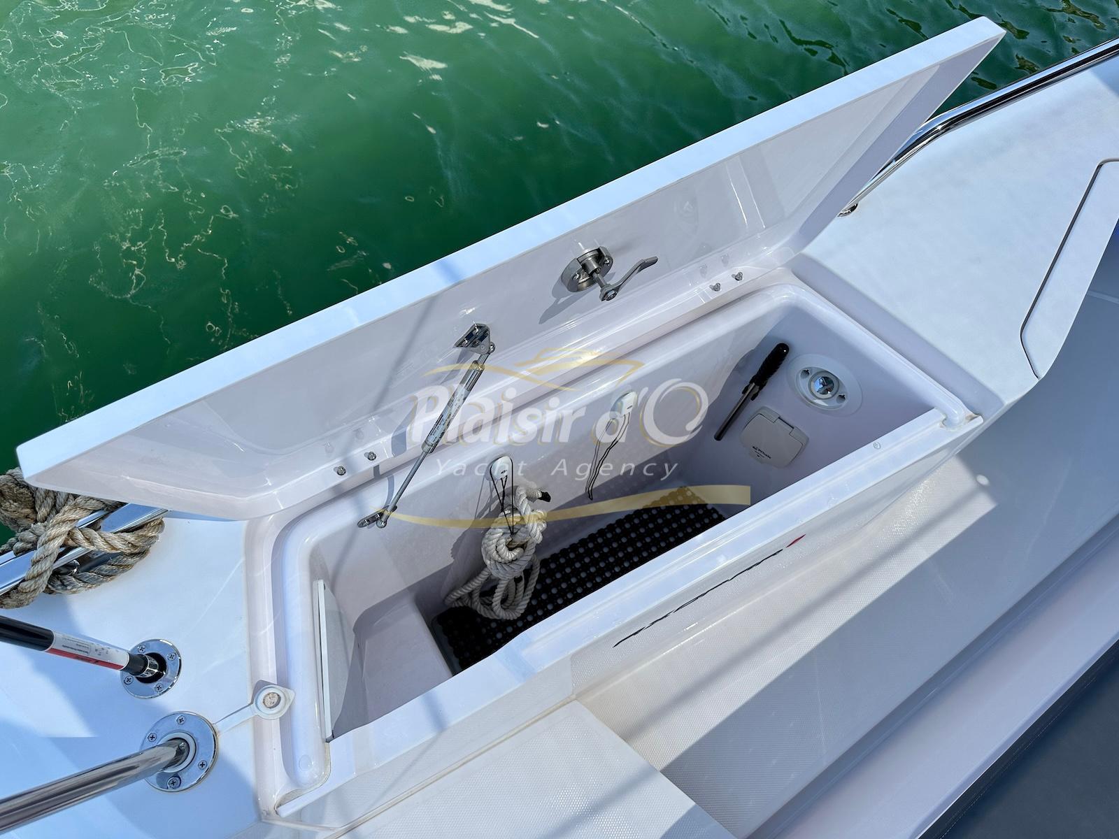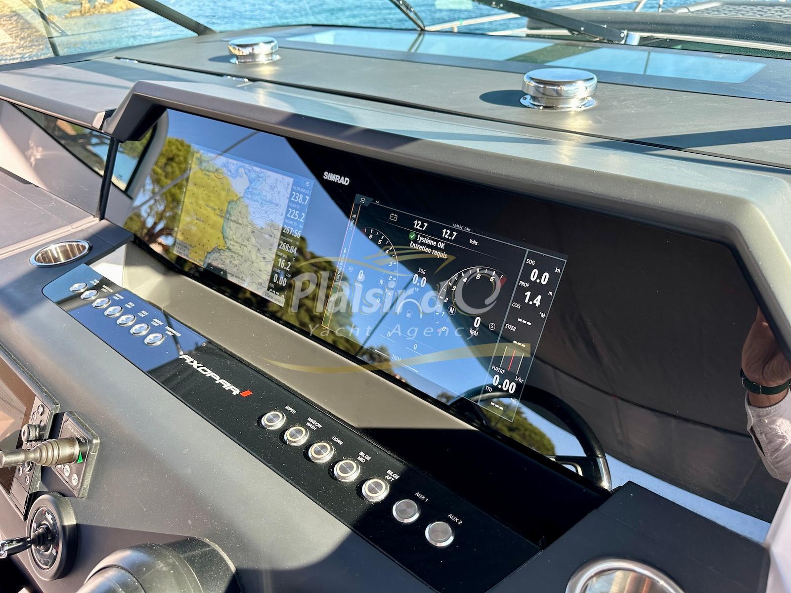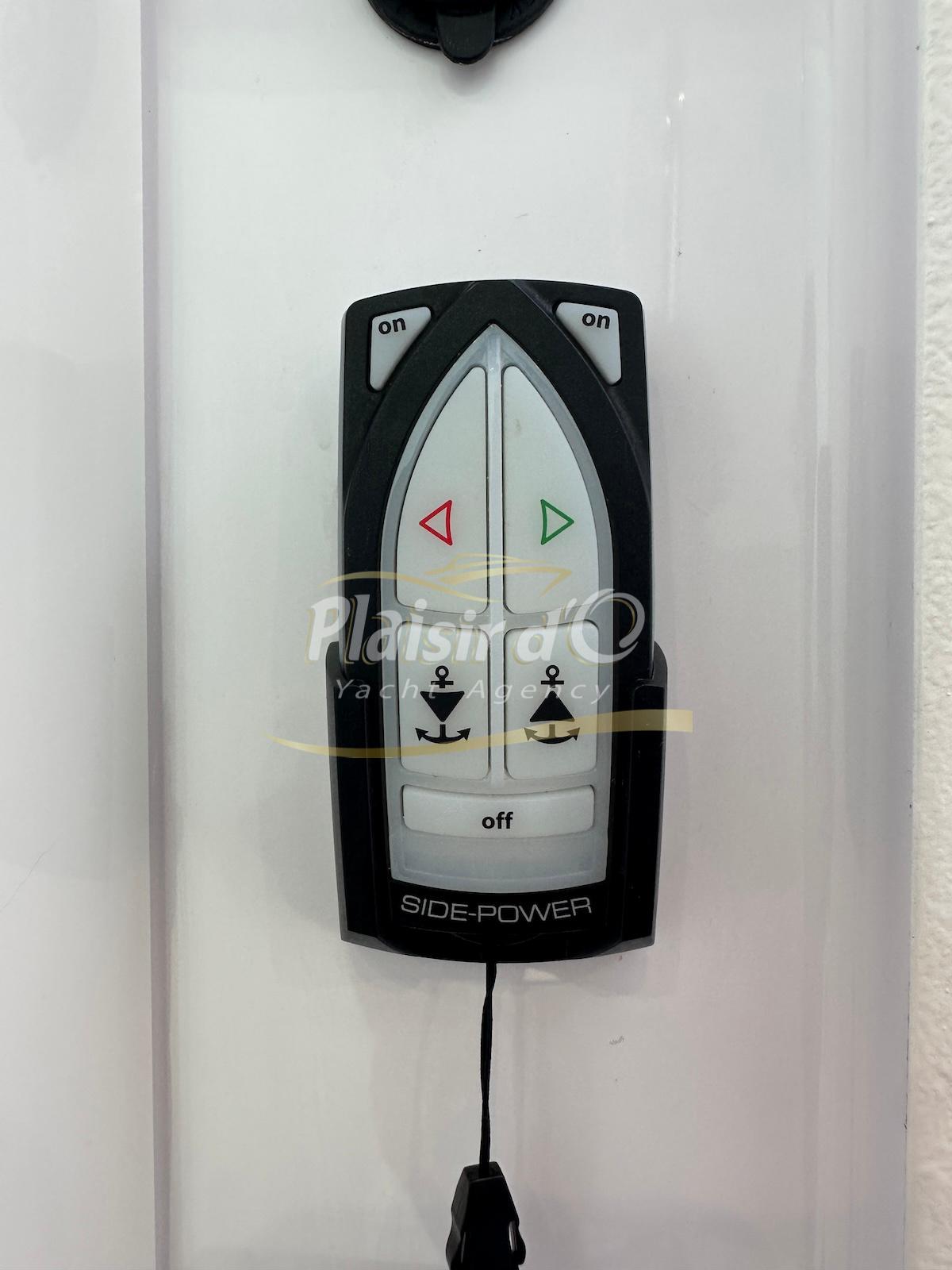 Full option : Double écran SIMARD IDS, système Fusion, VHF, Guindeau électrique avec télécommande sans fil, propulseur d'étrave avec télécommande sans fil, flaps, mat de ski, taud de soleil avec mats carbones, table de cockpit, mouillage Inox, ancre ultra Inox, WC électrique, douchette de cockpit...