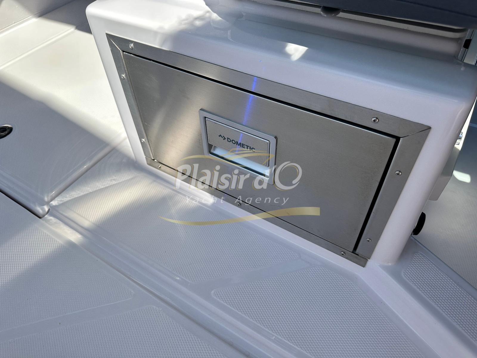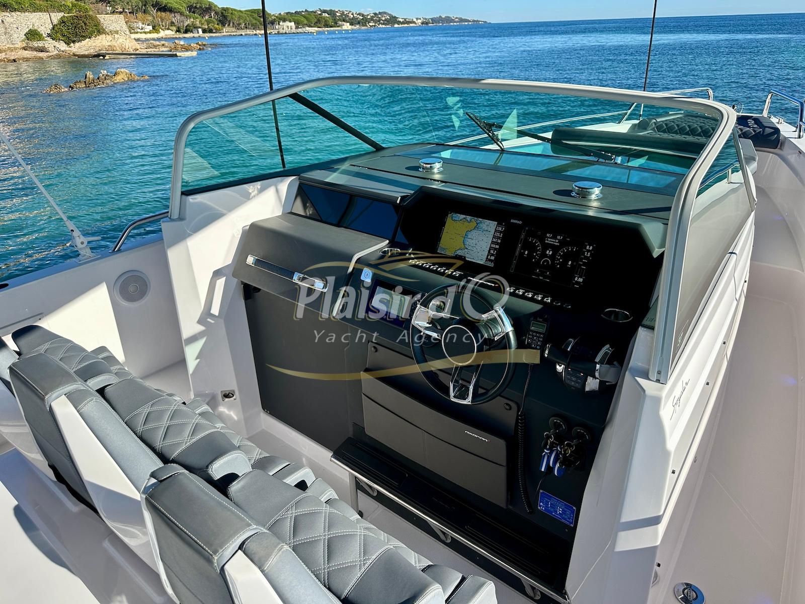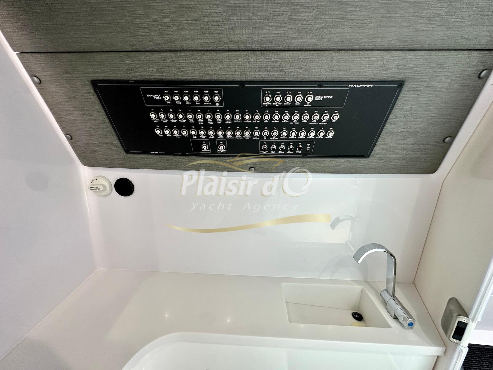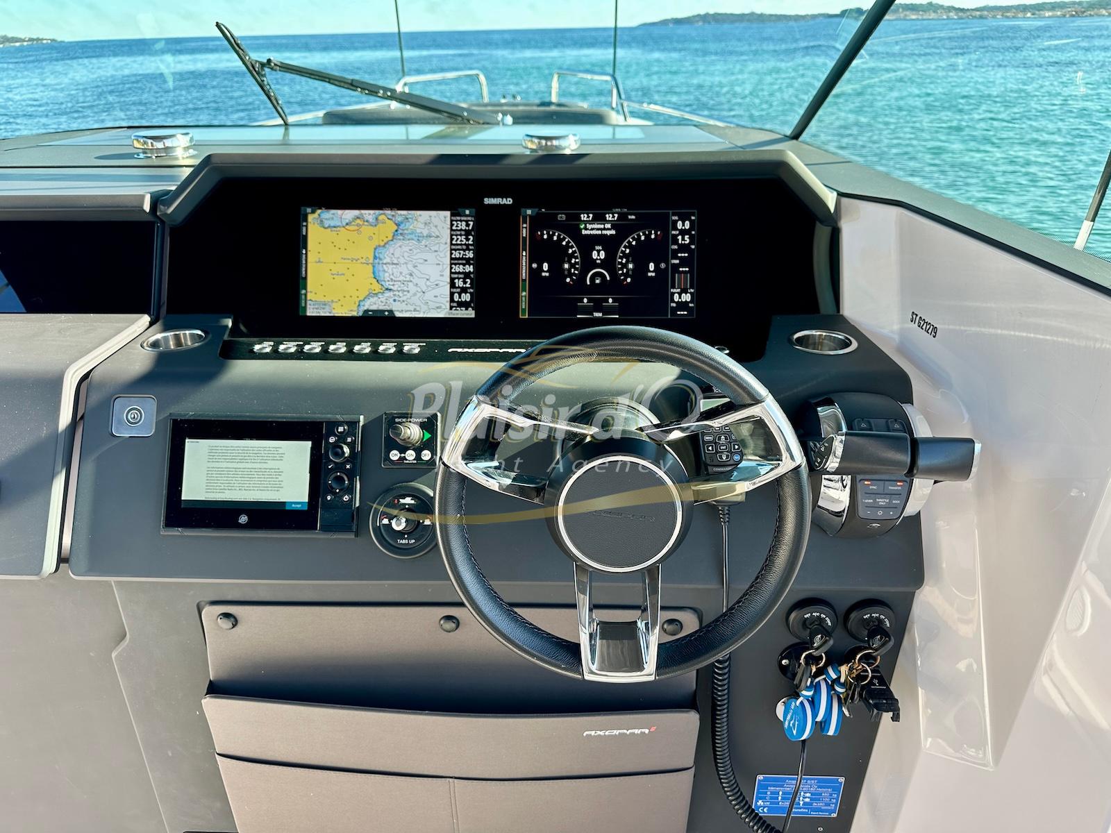Full option : Double écran SIMARD IDS, système Fusion, VHF, Guindeau électrique avec télécommande sans fil, propulseur d'étrave avec télécommande sans fil, flaps, mat de ski, taud de soleil avec mats carbones, table de cockpit, mouillage Inox, ancre ultra Inox, WC électrique, douchette de cockpit...