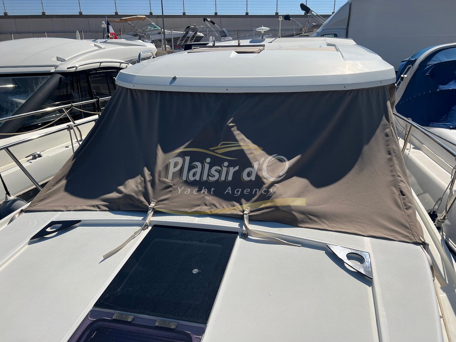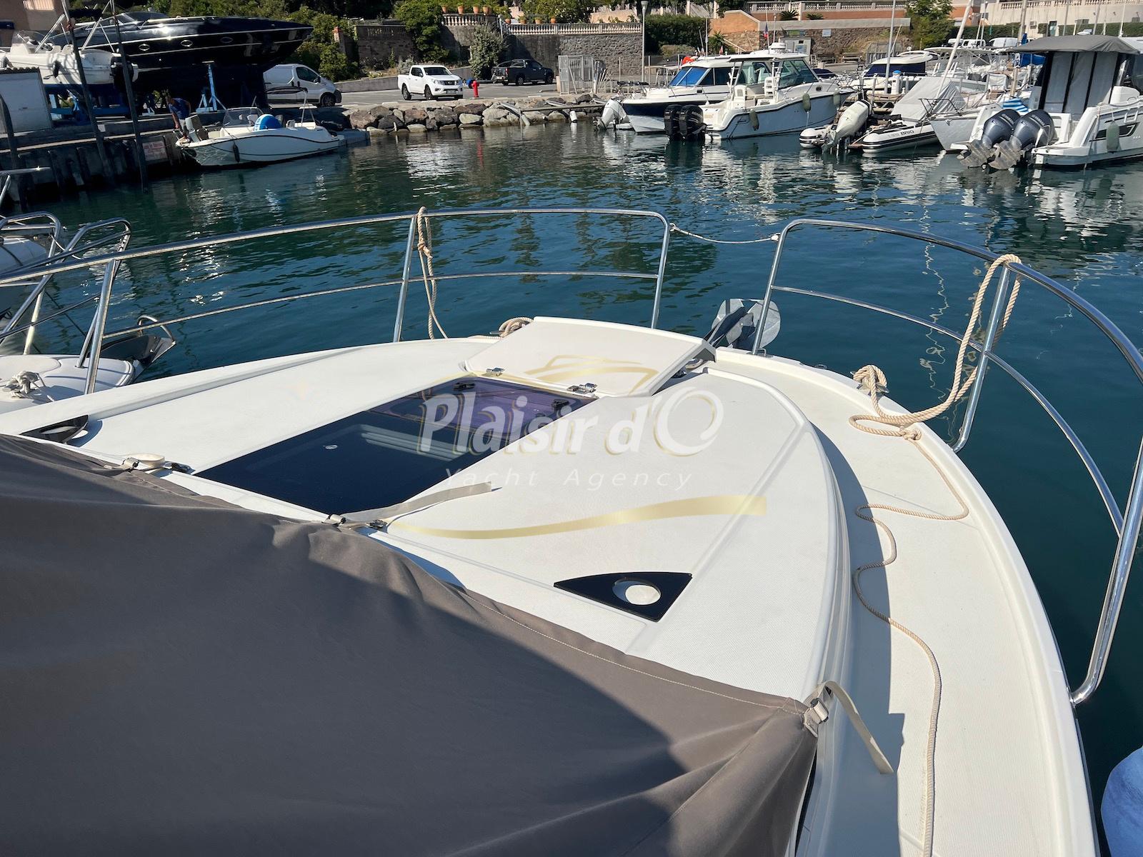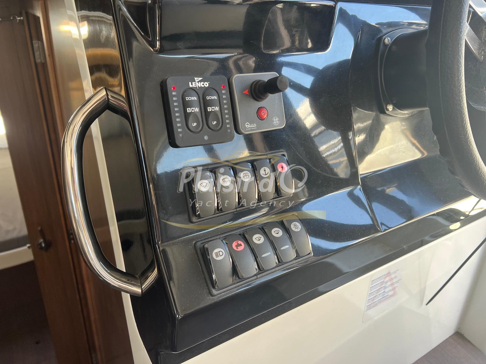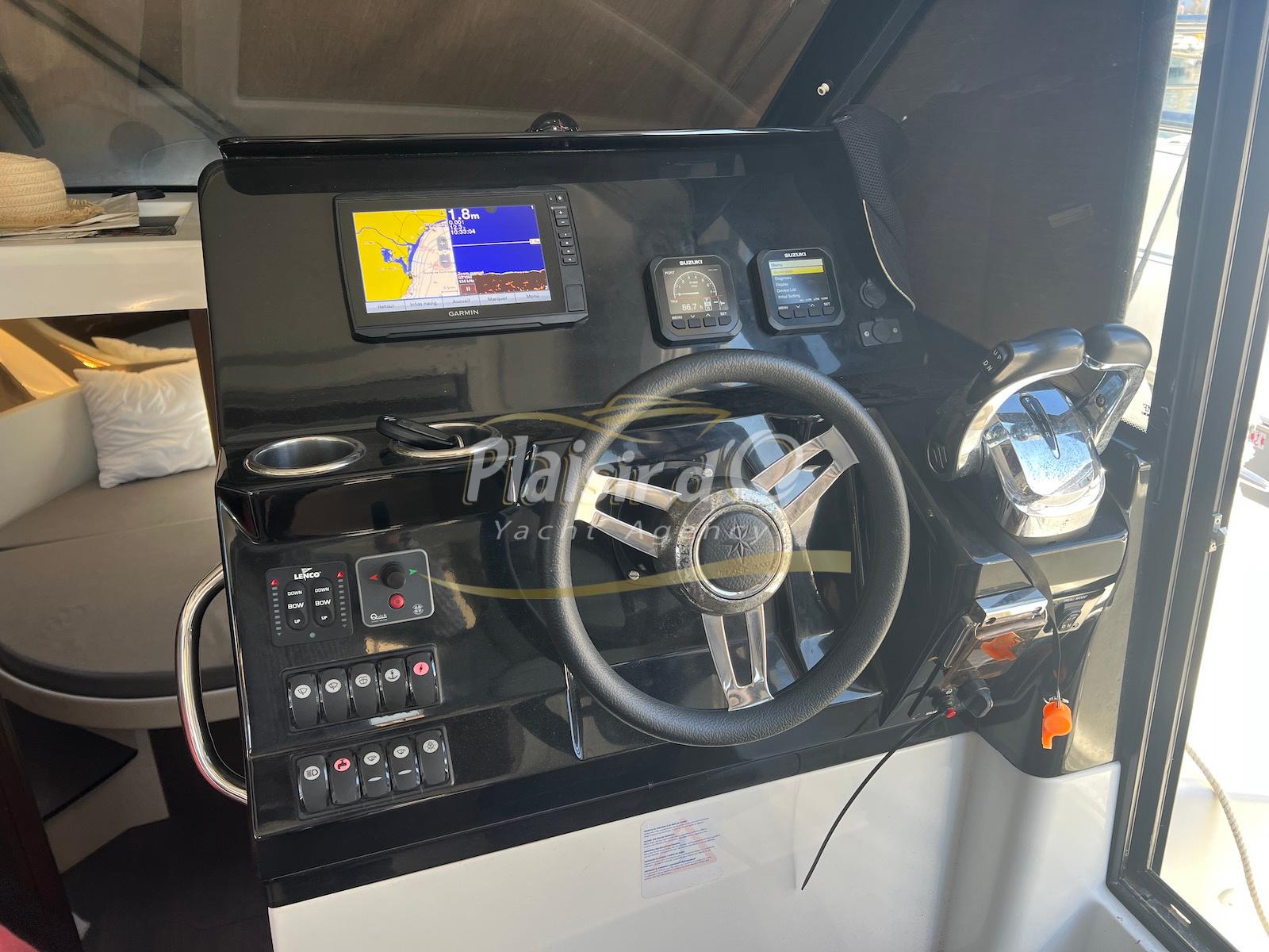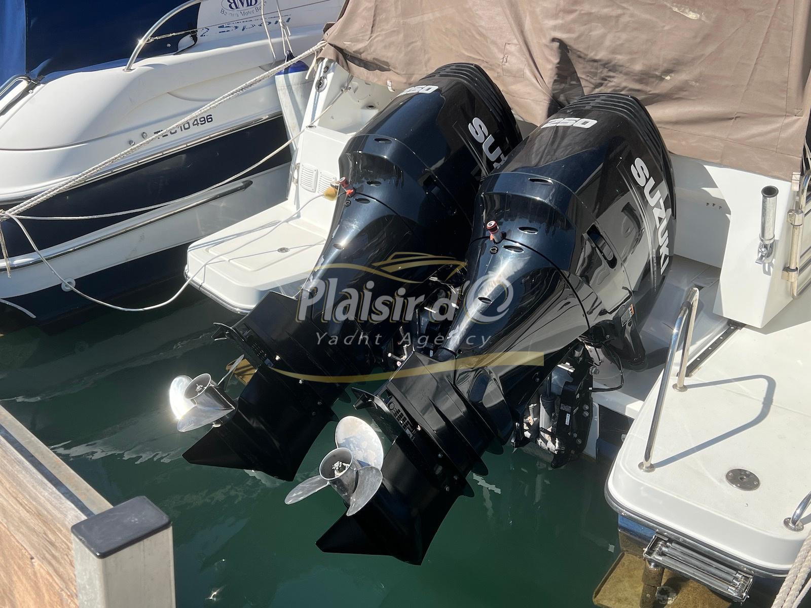 Nombreuses options : chauffage Webasto, propulseur d’étrave, flaps Lenco, taud de camping micro perforé, taud de pare brise complet, bain de soleil avant et arrière…