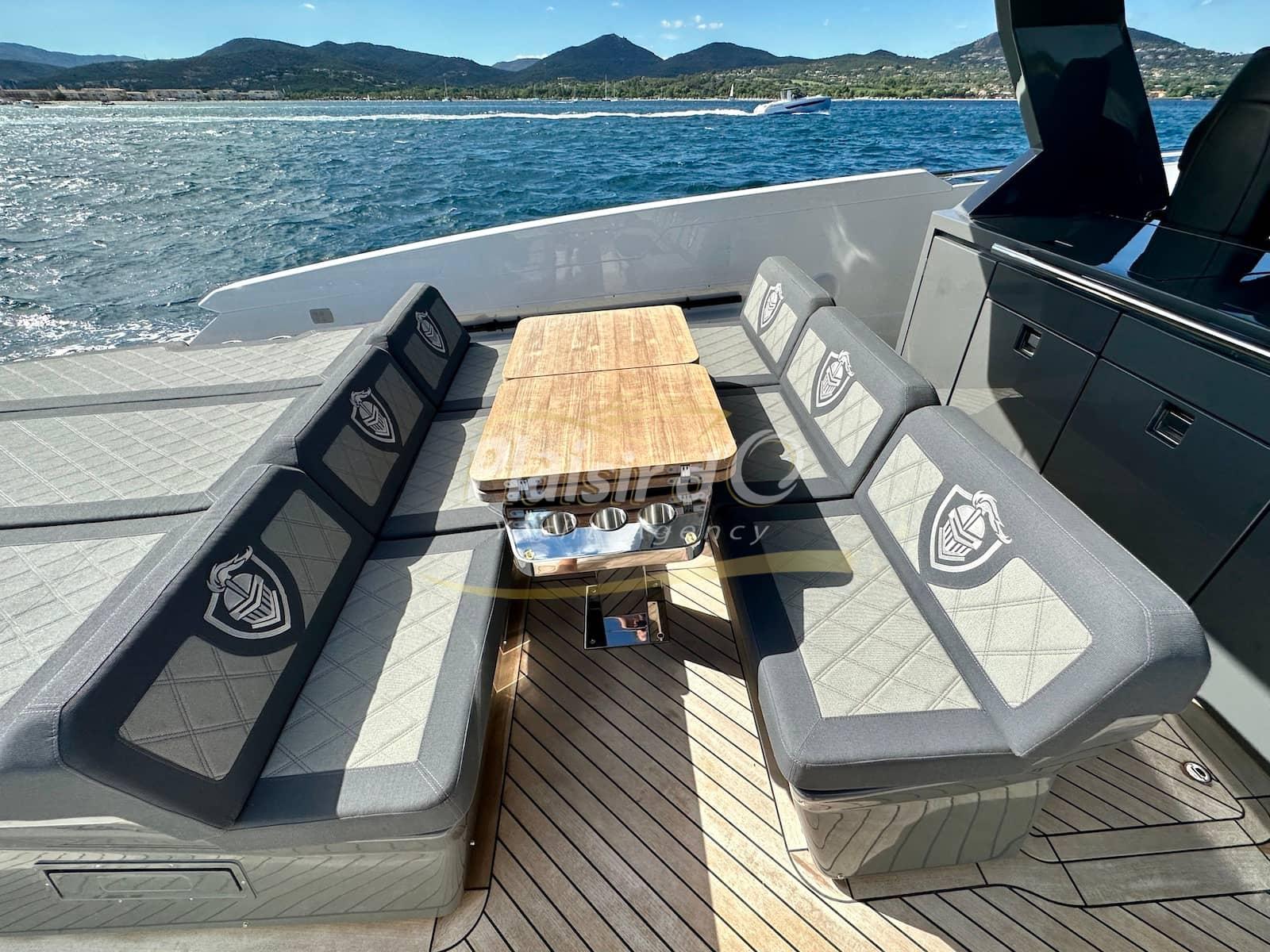 plan de pont très confortable, disposant de deux immenses bains de soleil, coin repas fixe et coin cuisine avec 2 immenses frigo et ice maker.