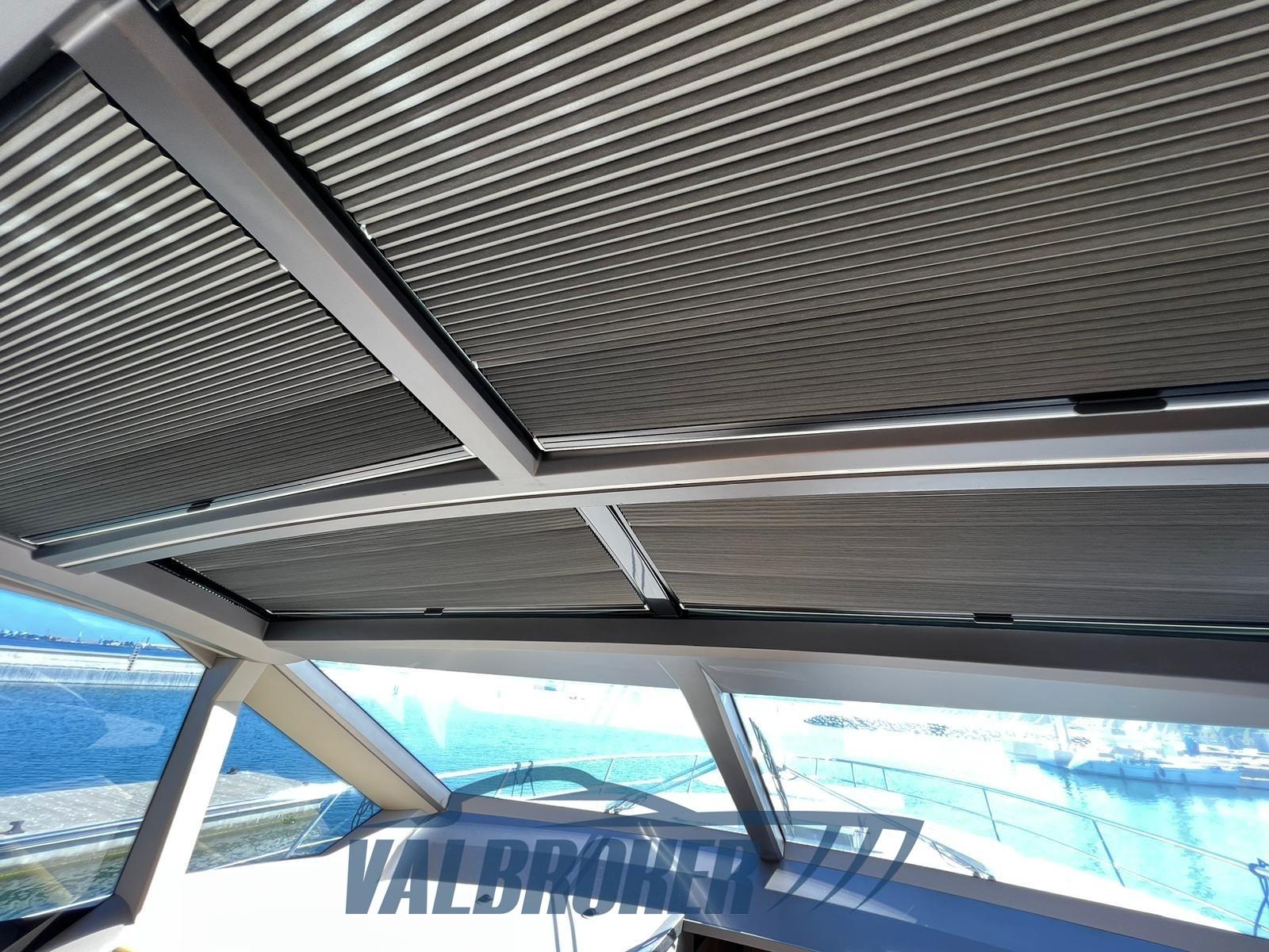 Une cabine principale pleine largeur avec sa propre salle de bain attenante a une entrée séparée du salon. La cabine VIP est située à l’avant et deux cabines doubles équipées, l’autre avec salle de bain privée. Le toit rigide est équipé d’une capote à commande électrique pour permettre le soleil/l’ombre.