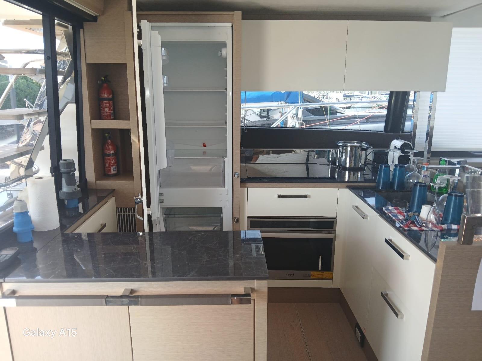Cuisine équipée ouverte sur la carré panoramique, lumineux avec ses grandes baies vitrées.