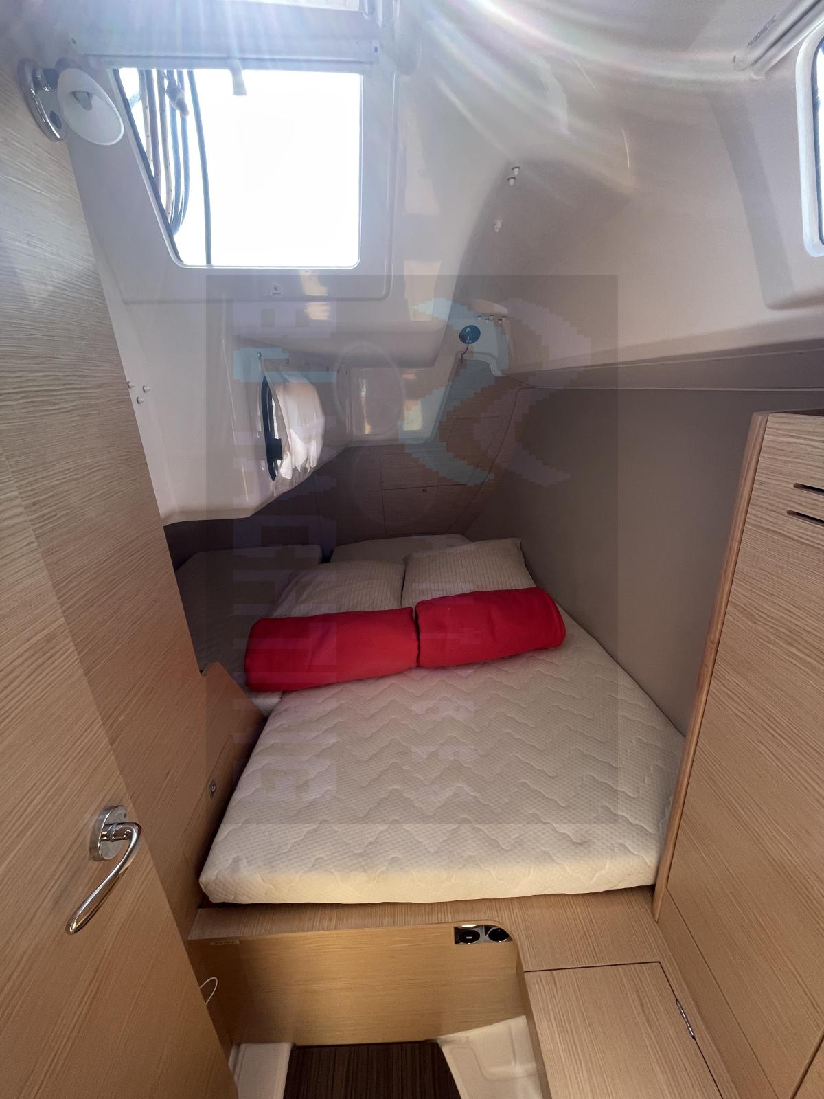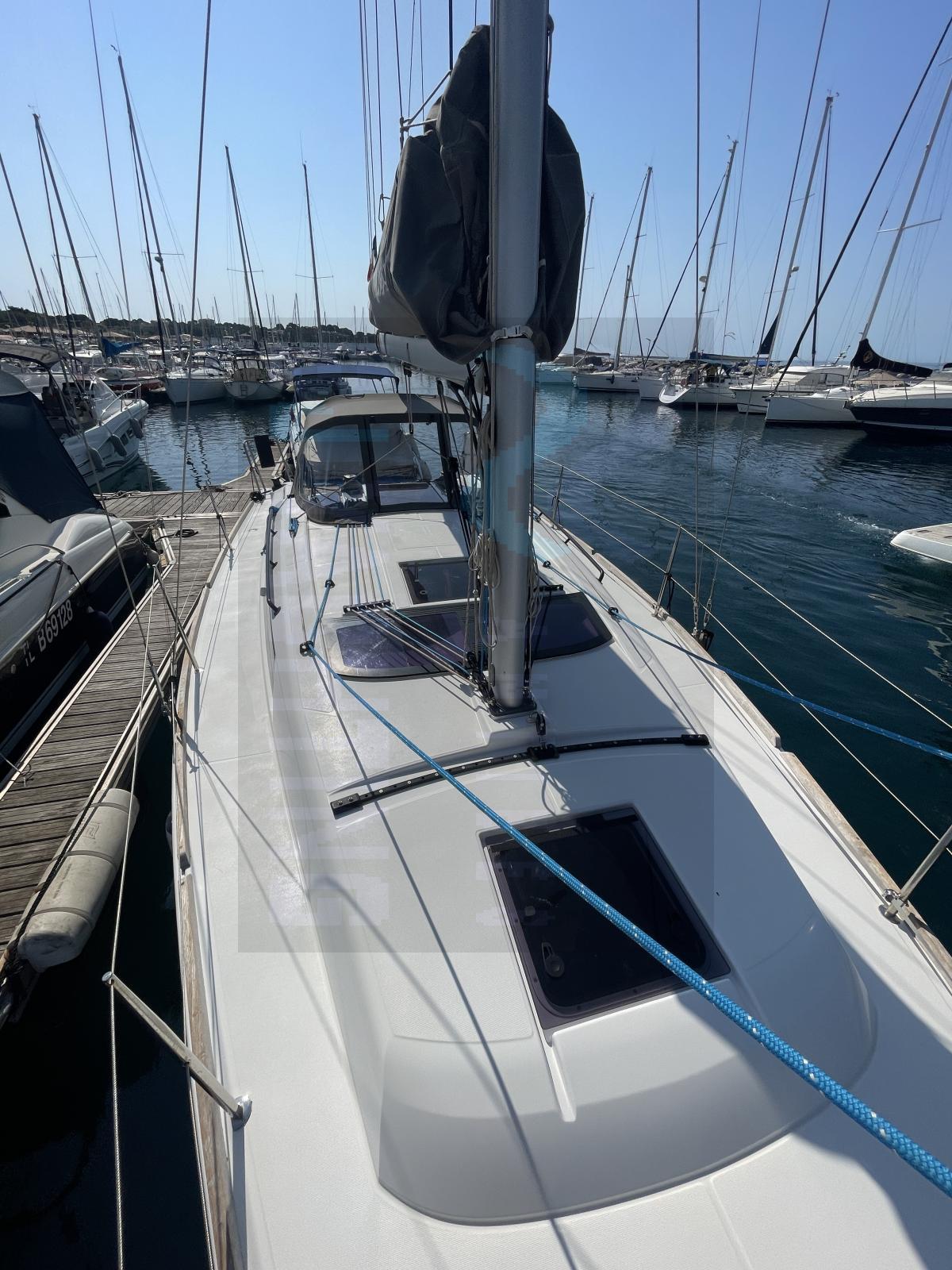 Son plan de pont est optimisé : barre franche, winchs parfaitement positionnés, et poste de barre dégagé pour une excellente visibilité. L’équipement de pont comprend un guindeau électrique 700 W, une douche de pont, une capote de descente, et un chauffe-eau 20 L pour plus de confort à bord.