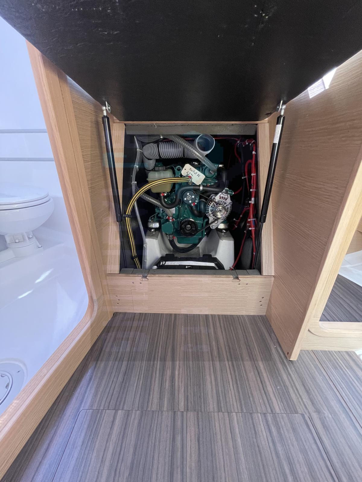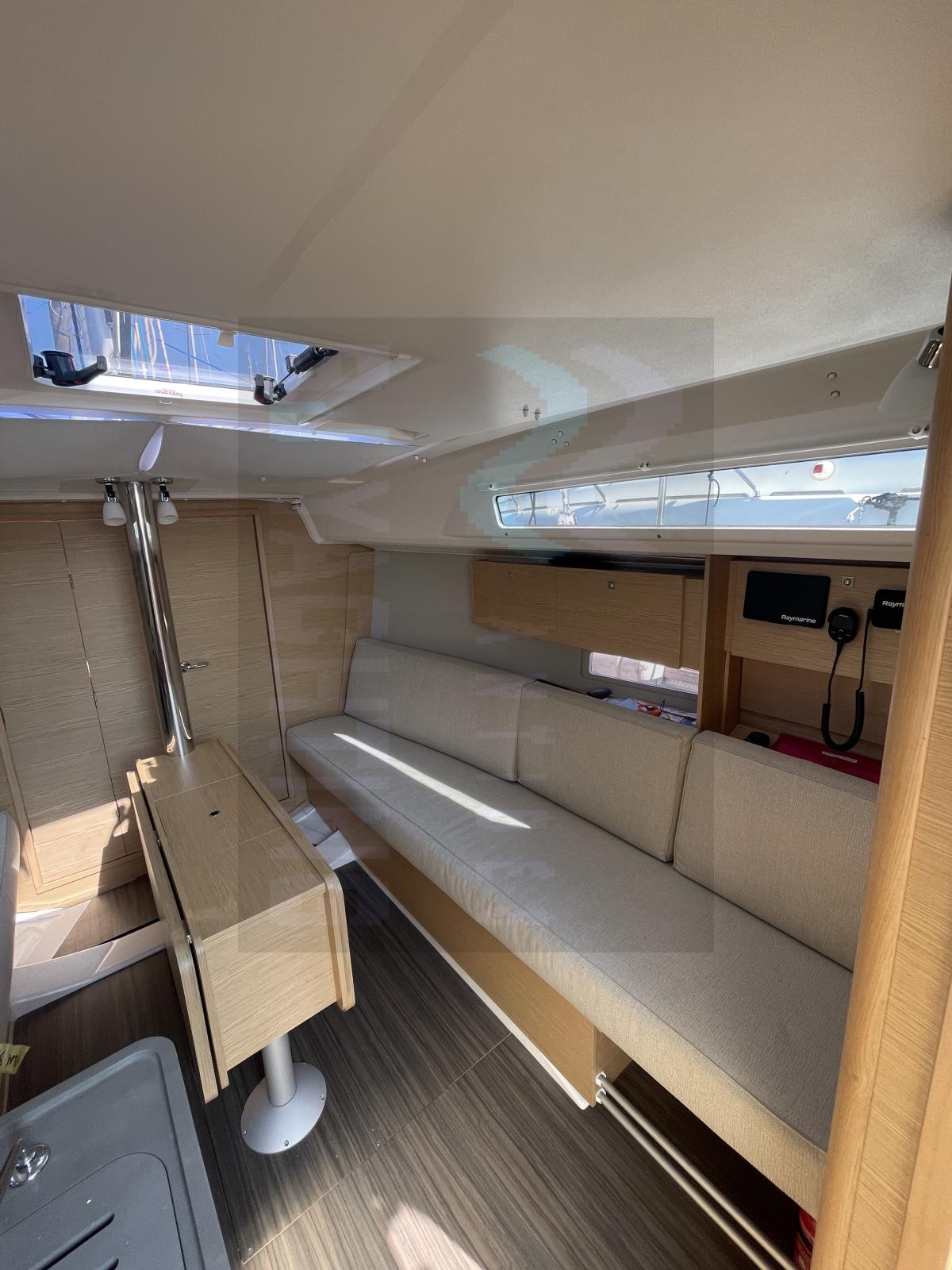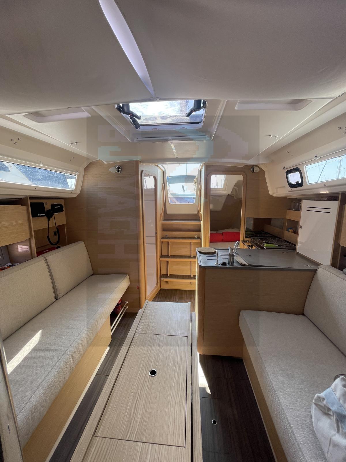À l’intérieur, le carré chaleureux en bois clair accueille deux cabines et une grande salle d’eau. La cuisine en L est parfaitement équipée pour des croisières prolongées, avec un bel espace de rangement et une finition soignée typique de la marque.