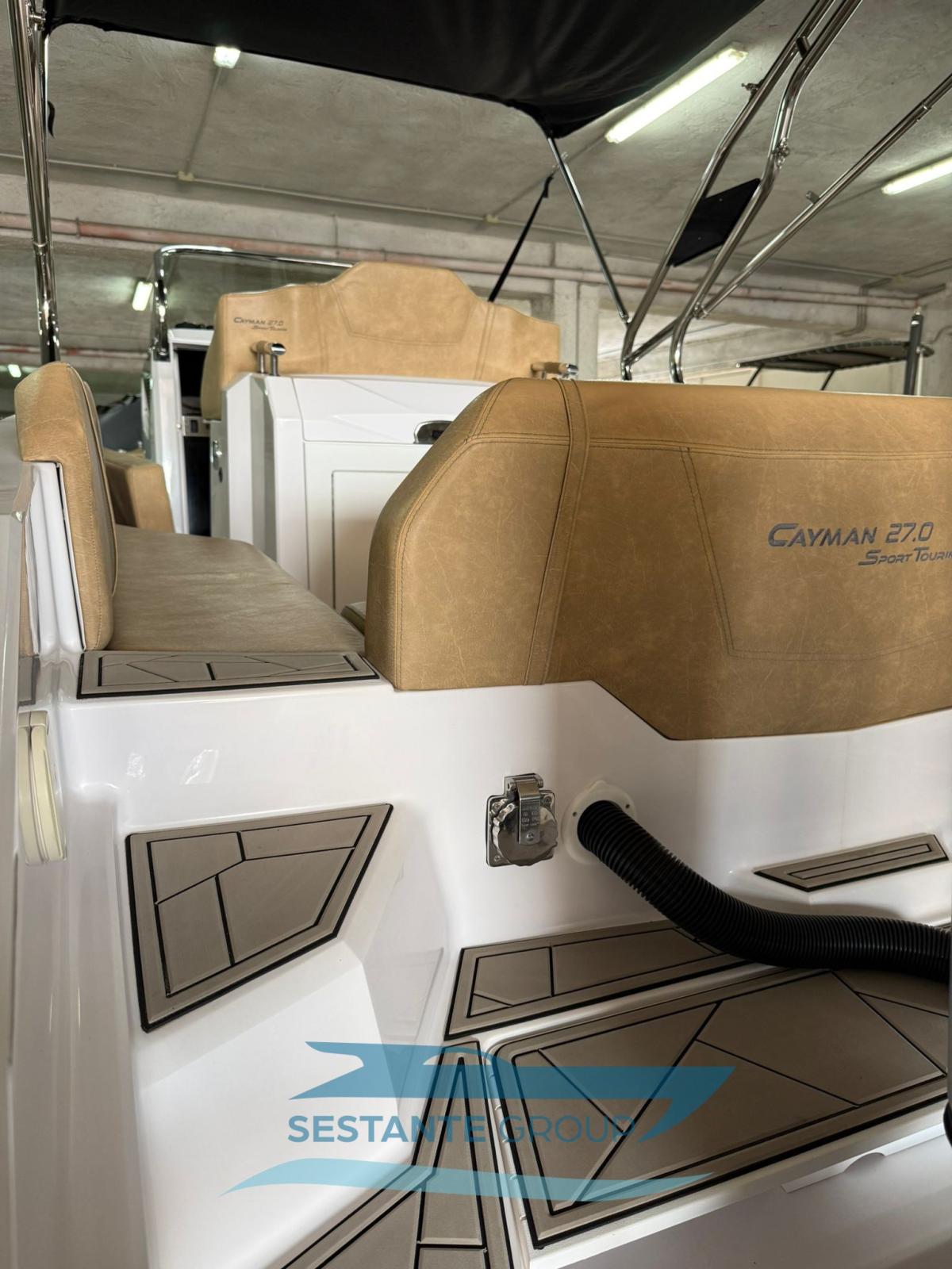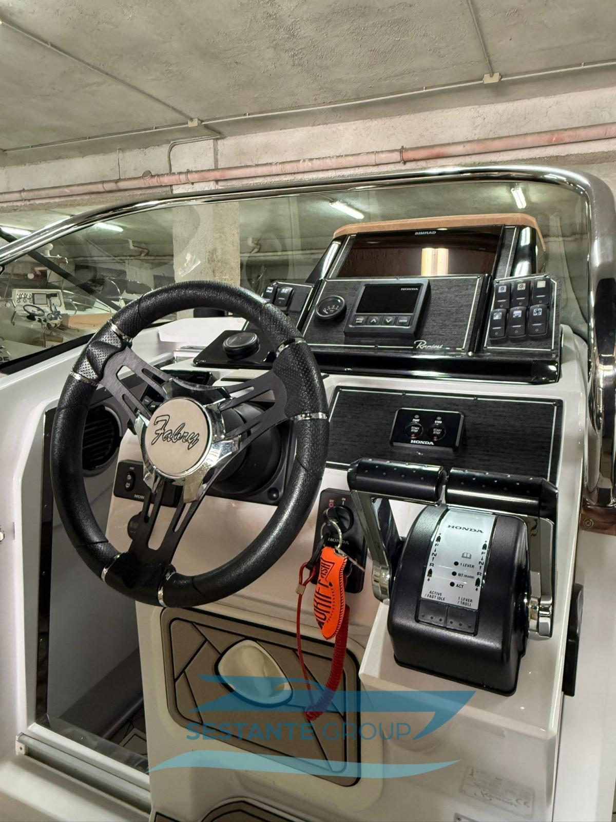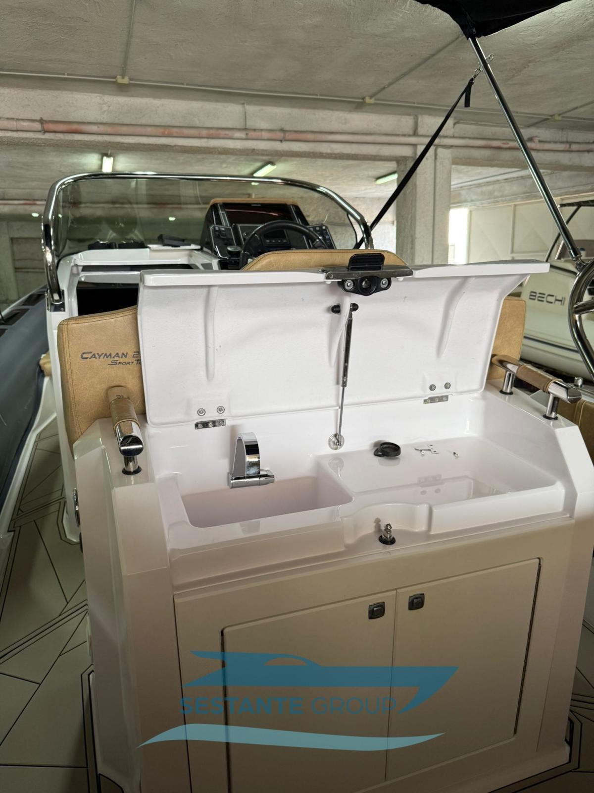 Alarme moteur, Alternateur, Eau sous pression, Passavant en teck, Douche de cockpit, Lavabo dans le cockpit, Éclairage de courtoisie, Pont en teck, Cockpit en teck, Prise de quai, Rollbar, Guindeau électrique, Echelle de bain, Corne.