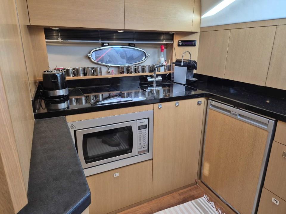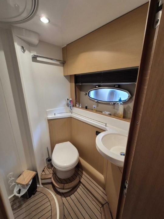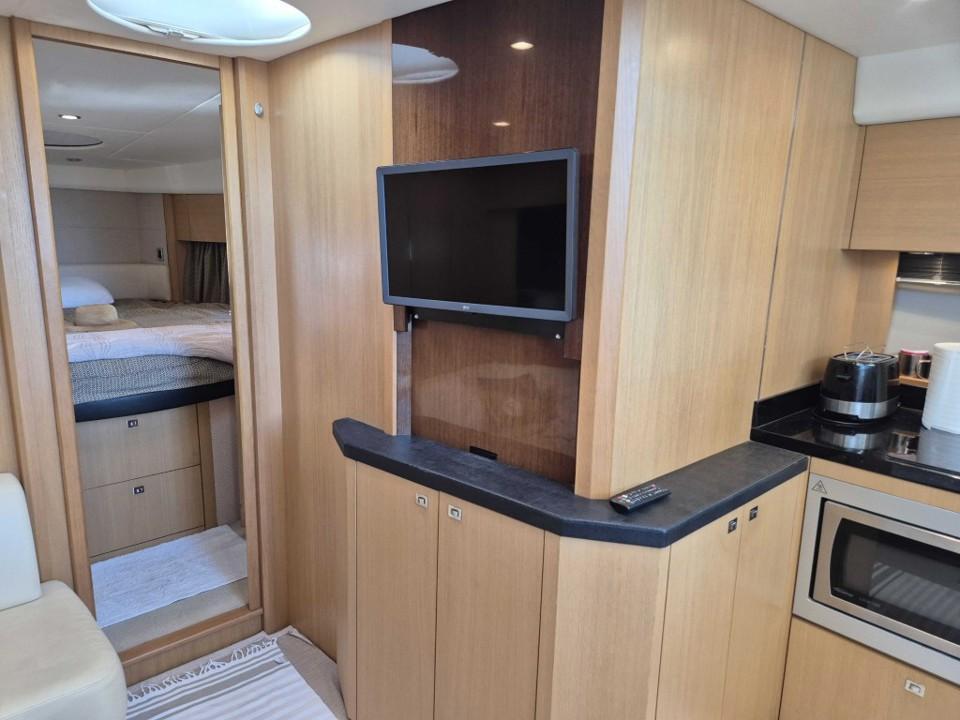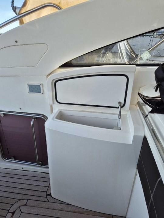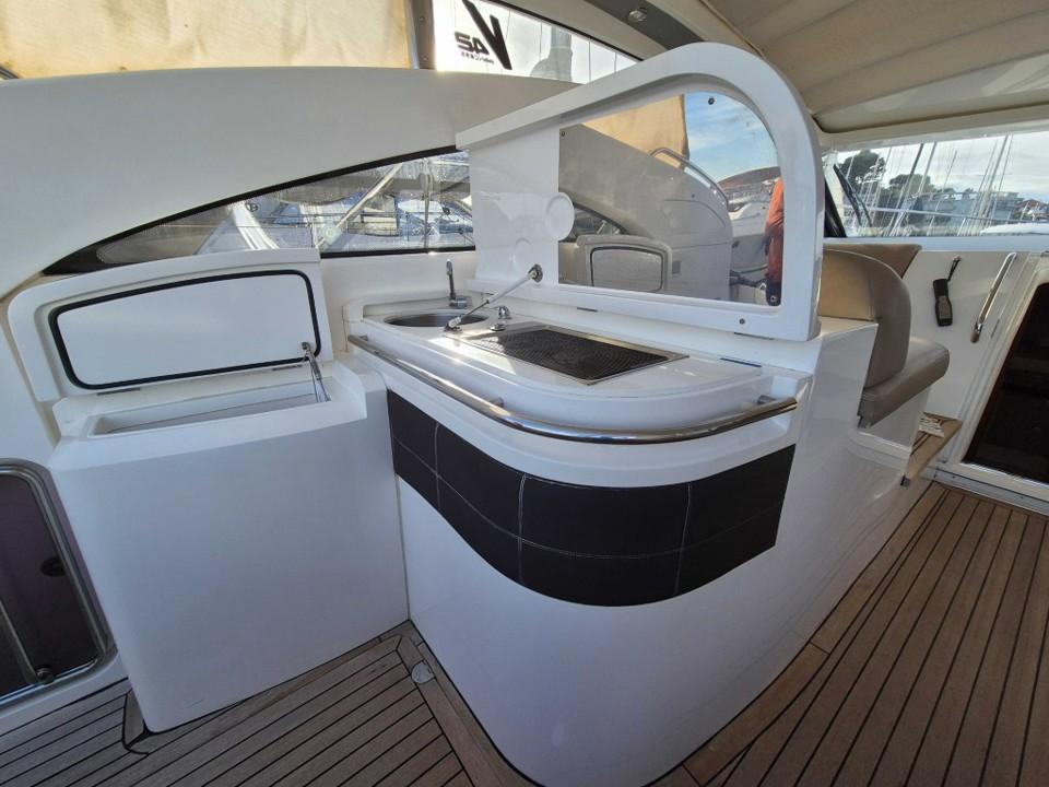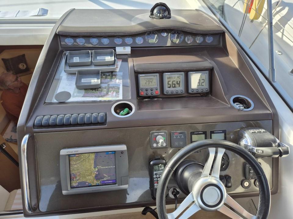 Le cockpit généreux offre un espace convivial avec bain de soleil avant et arrière toit ouvrant électrique et sellerie en parfait état l’intérieur raffiné propose deux cabines spacieuses une cuisine entièrement équipée et une salle d’eau moderne pour un confort optimal à bord profitez de la climatisation réversible du propulseur d’étrave et du garage à annexe pour vos escapades nautiques l’électronique est complète avec GPS traceur pilote automatique VHF sondeur et guindeau électrique entretien suivi avec rigueur ce Princess V42 est prêt à prendre la mer dès aujourd’hui,