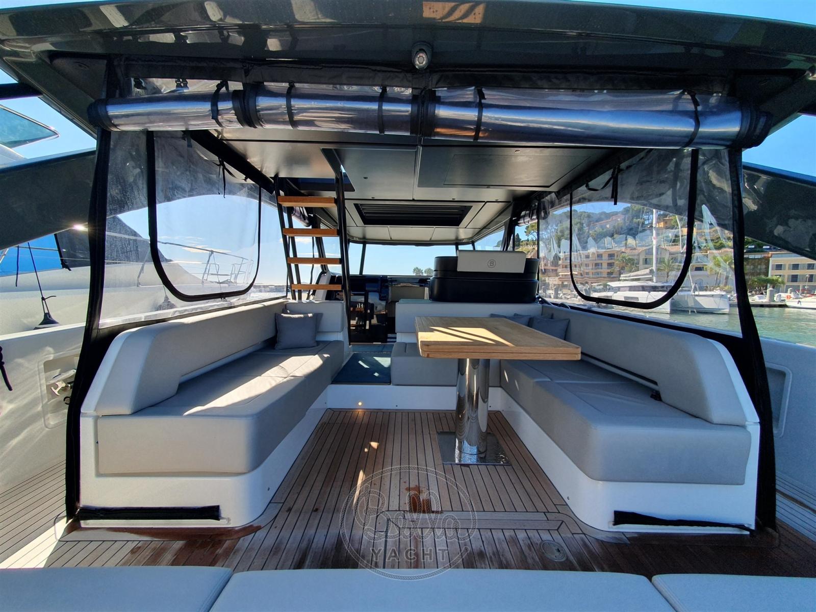 Le cockpit, déjà bien protégé par son pare-brise enveloppant, peut être entièrement fermé par des fermetures souples transparentes amovibles, et chauffé ou climatisé pour profiter du yacht en toute saison.