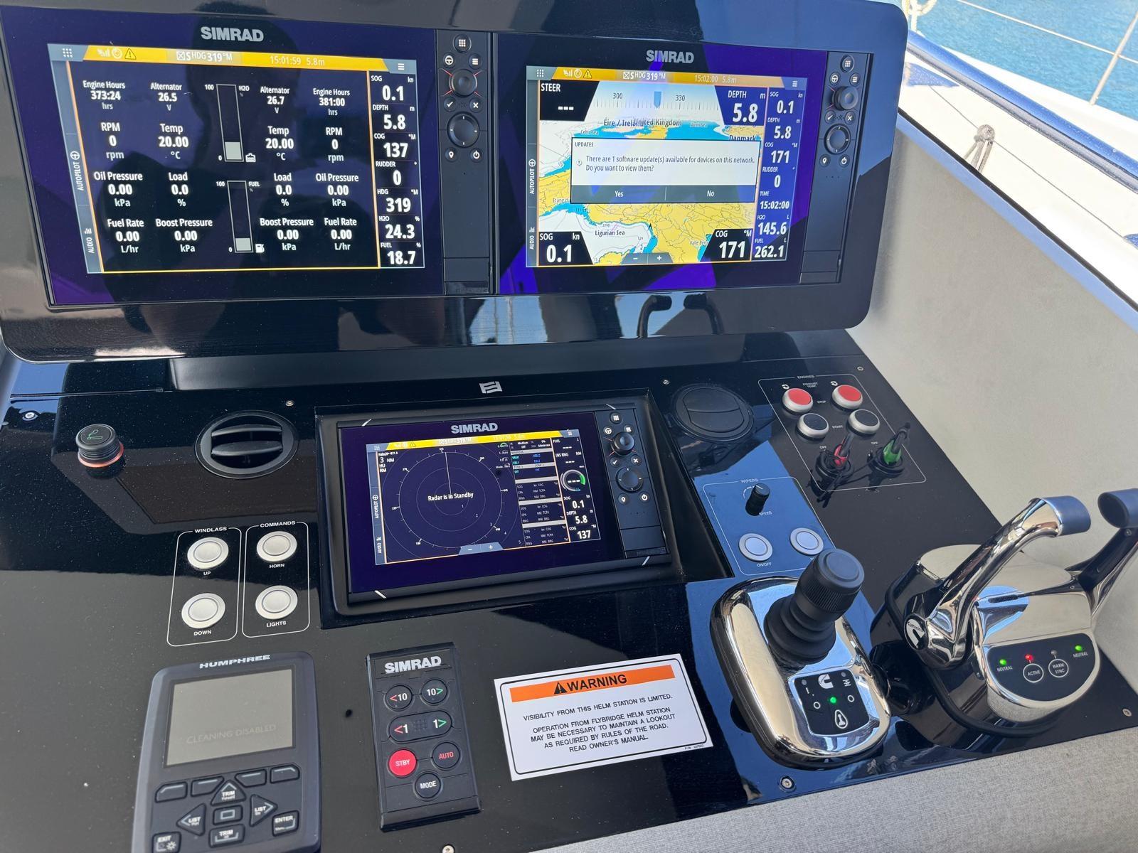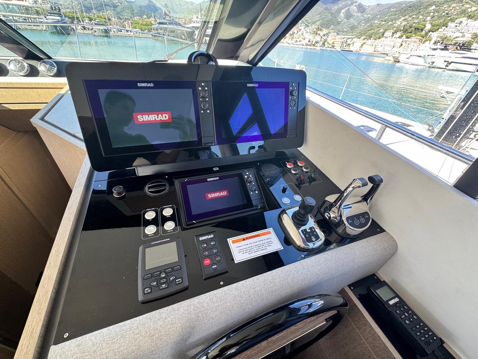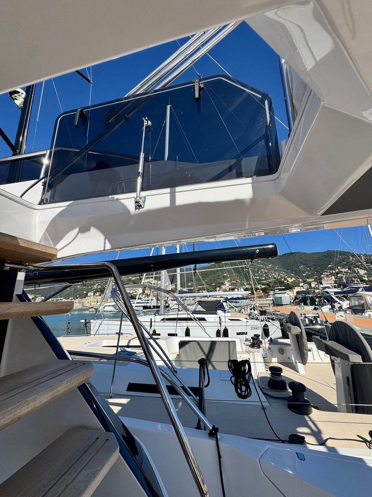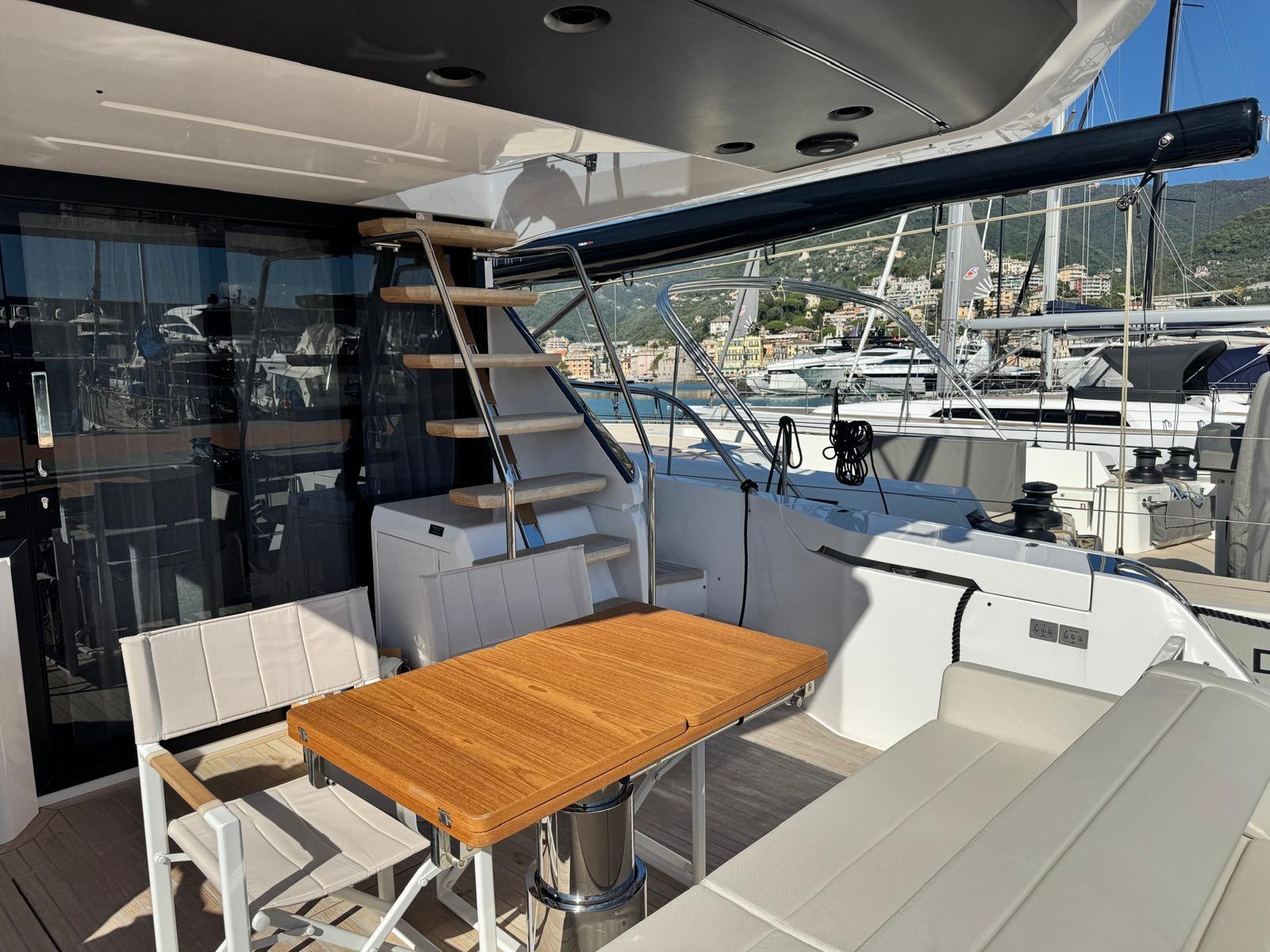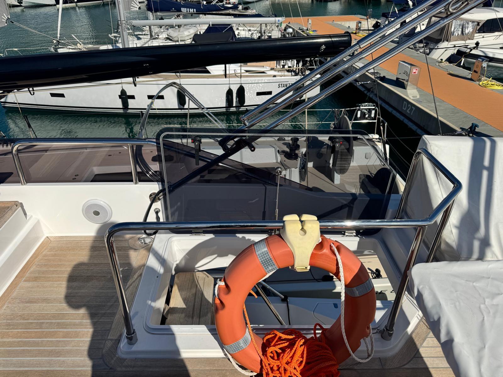 Alarme gaz, Alarme de pompe de cale, Ancre (30 kg), Eau sous pression, Câble d’alimentation à quai, Double barre à roue, Lavabo dans le cockpit, Éclairage de courtoisie, Passerelle, Plateforme arrière (Con discesa a mare), 4 Pompe de cale automatique, 4 Pompe de cale électrique, Porte latérale, Cockpit en teck, Prise de quai, Guindeau électrique, Echelle de bain, Selles pour Annexe, table de cockpit (Telescopico), Table pliante de salon, Annexe, Filières avec sortie latèrale, Corne, 2 Winch électrique (Poppa dx e sx).