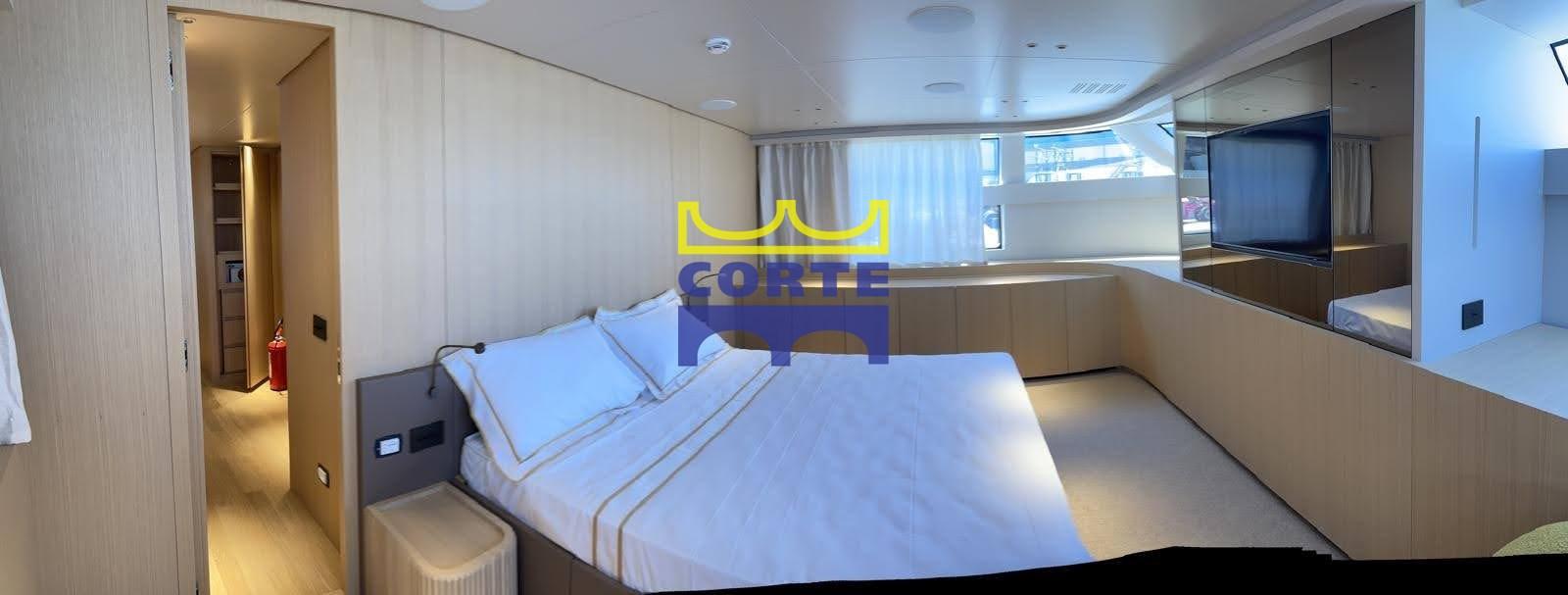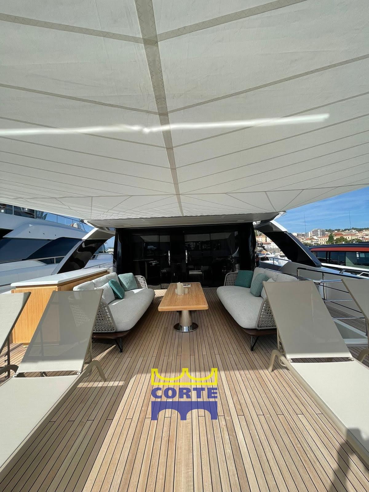 Coussins arrieres, Coussin avant, Sellerie de fly, Taud de soleil (per la zona full beam davanti alla timoneria e per la zona upper deck).