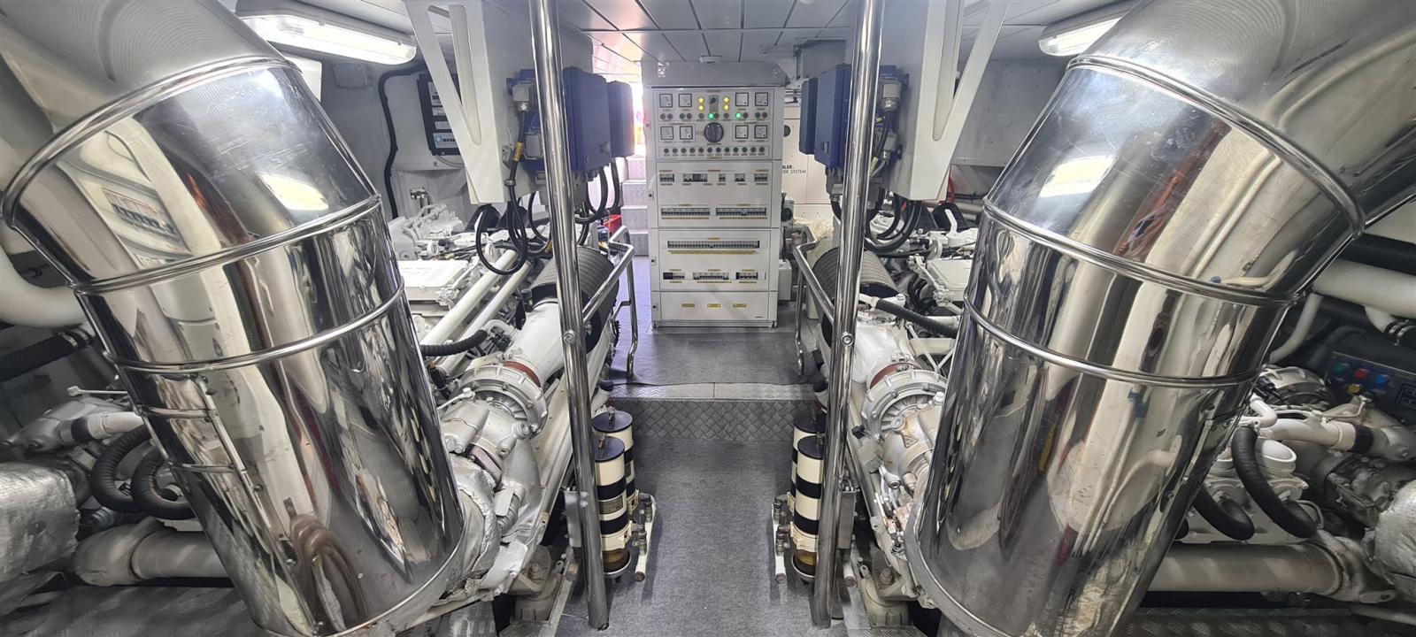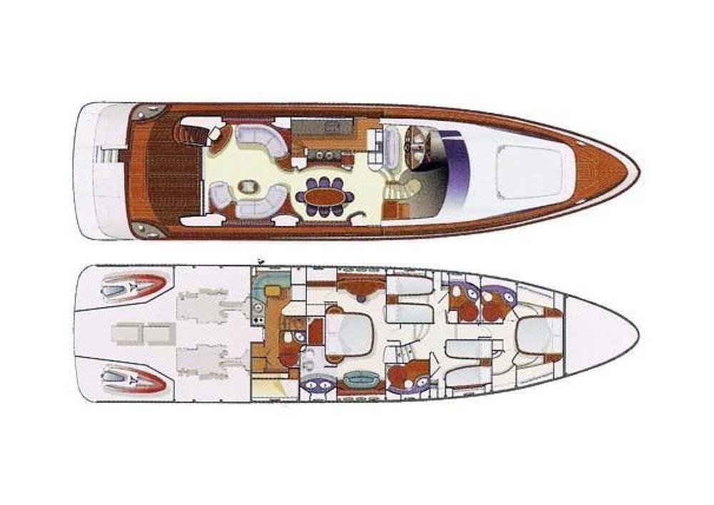 Alarme gaz, Alarme moteur, Alarme de pompe de cale, Ancre (con 100 m di catena da14), 2 Eau sous pression, 12 Batteries, Passavant en teck, 2 Chargeur de batterie, Câble d’alimentation à quai, Douche de cockpit, Double barre à roue, Propulseur de poupe (elettrica), Propulseur d'étrave (idraulica), Phares fixes arrière, Phare de poursuite, 2 Flaps électriques, 2 Garage à annexe, Grue de flybridge (Opacmare), Extincteur(s) fixe(s), Indicateurs de flaps, Lavage de chaine, Éclairage de courtoisie, Moniteur de batterie, Défenses, Passerelle (IDRAULICA), Plateforme arrière, Pompe de cale automatique, Pont en teck, Porte latérale, Cockpit en teck, 2 Prise de quai, Connexion eau sous pression à quai, Onduleur, Rollbar, Guindeau électrique (Lofrans), Echelle de bain, Selles pour Annexe, table de cockpit (allungabile fisso in teack), Corne, 2 Winch électrique arrière, Winch électrique avant.
