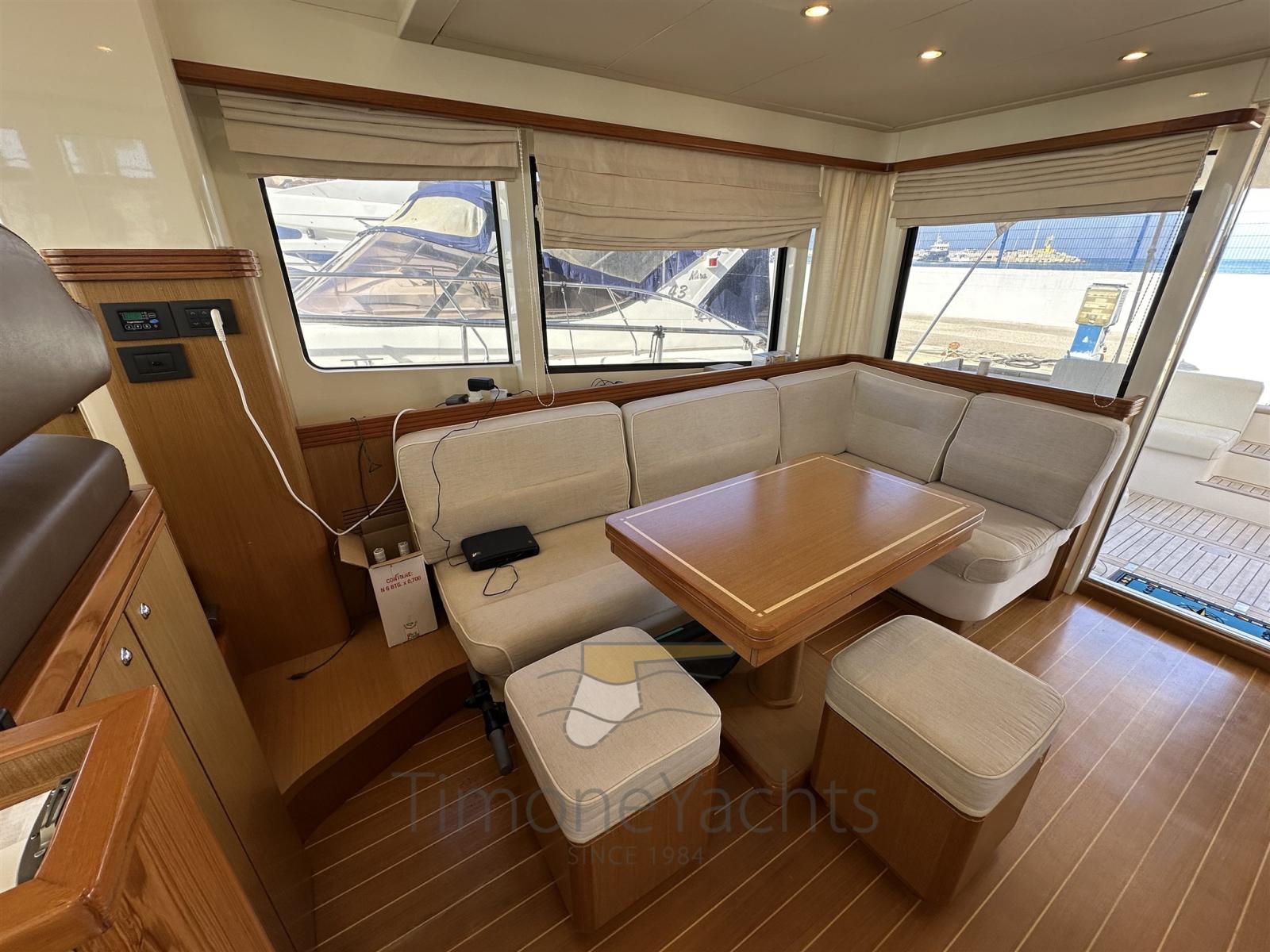 Le rouf est équipé de grandes fenêtres qui s’ouvrent verticalement et le pont principal abrite une confortable terrasse à l’avant, tandis que le flybridge abrite un deuxième bain de soleil et un coin dînette, avec canapé et table.