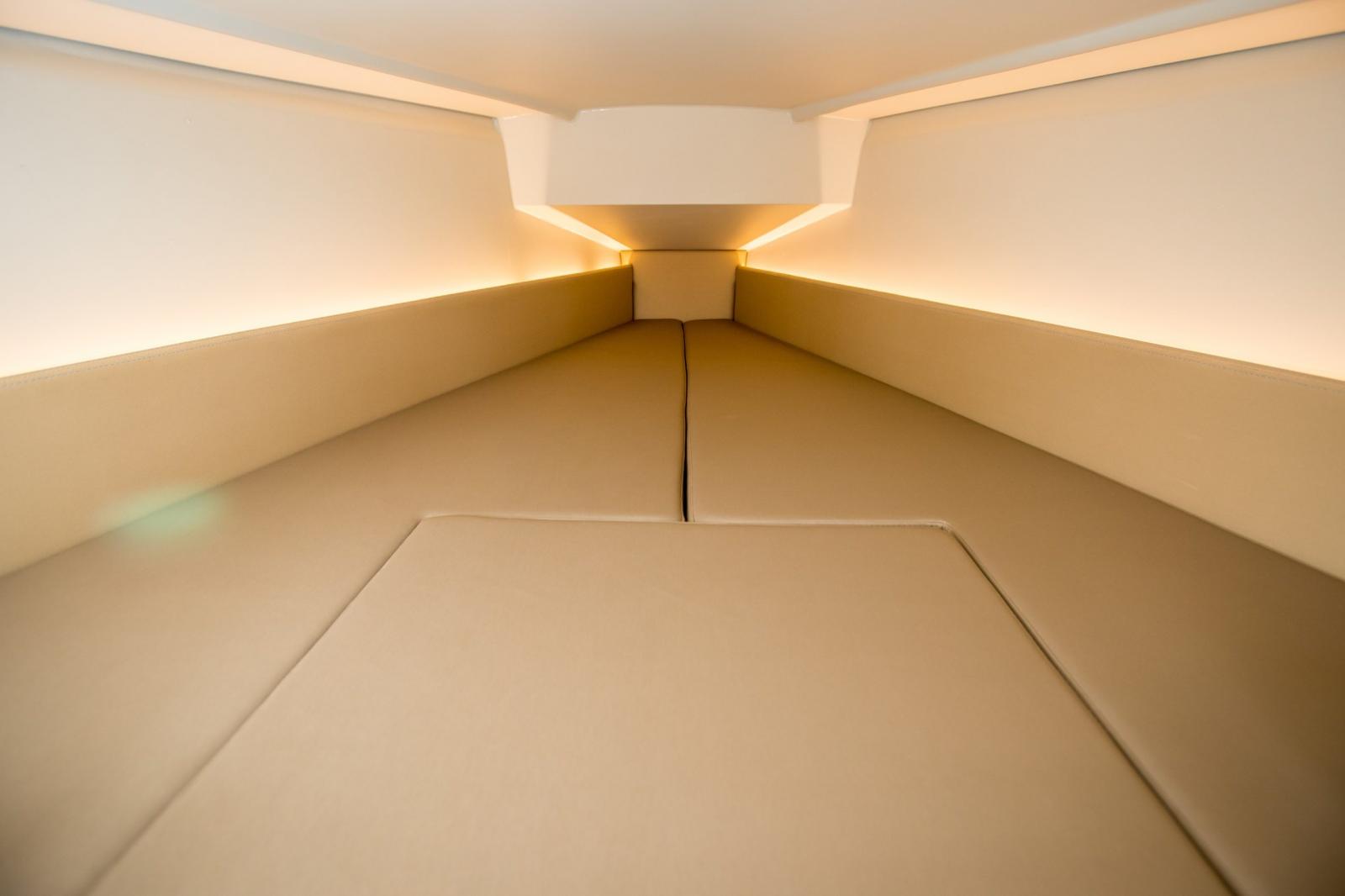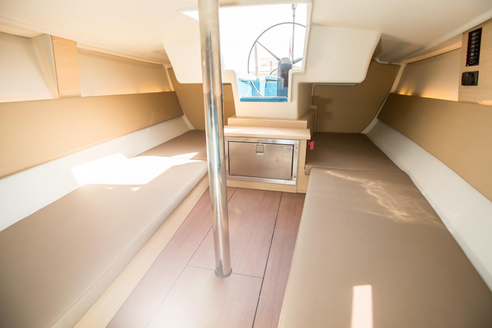 Deux places assises ou lits avec dossier dans le carré et rangement.