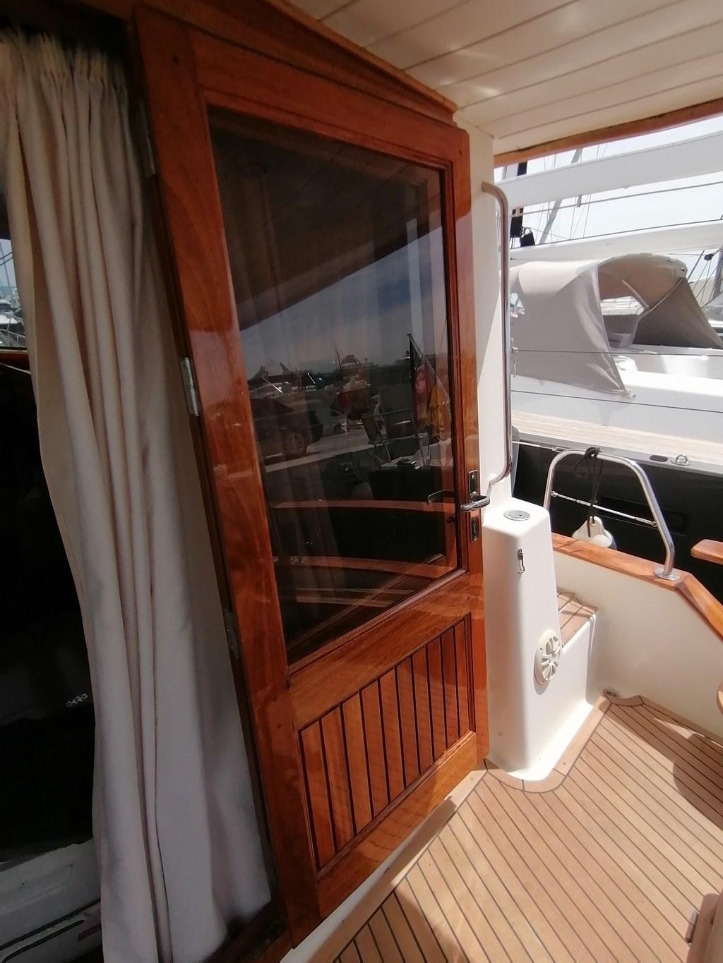 Alarme de pompe de cale, Eau sous pression, Passavant en teck, Couleur spéciale (Blue hull), Douche de cockpit, Double barre à roue, Extincteur(s) fixe(s), Moteur hors-bord pour annexe, Défenses, Passerelle, Pont en teck, Cockpit en teck, Guindeau électrique, Echelle de bain, table de cockpit, Annexe, Pont en teck, Winch électrique arrière.