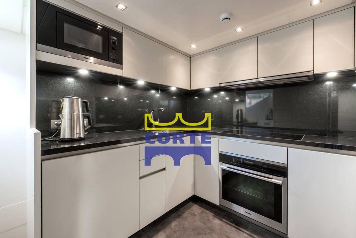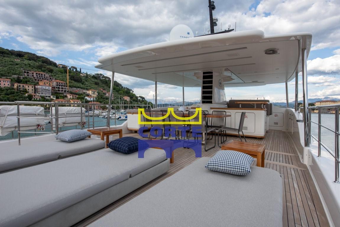Meuble de rangement, avec kitchenette. Bain de soleil à l’arrière avec chaises longues. Poste de pilotage. Platelage en teck.