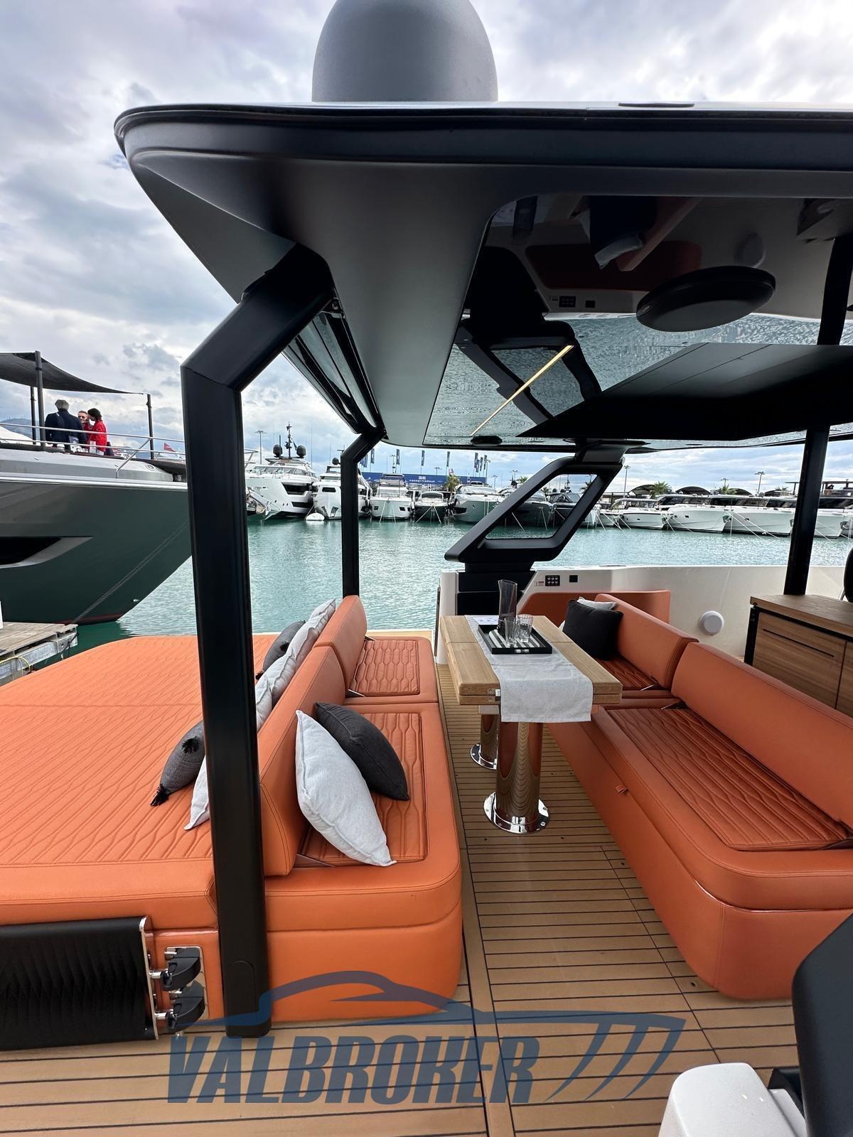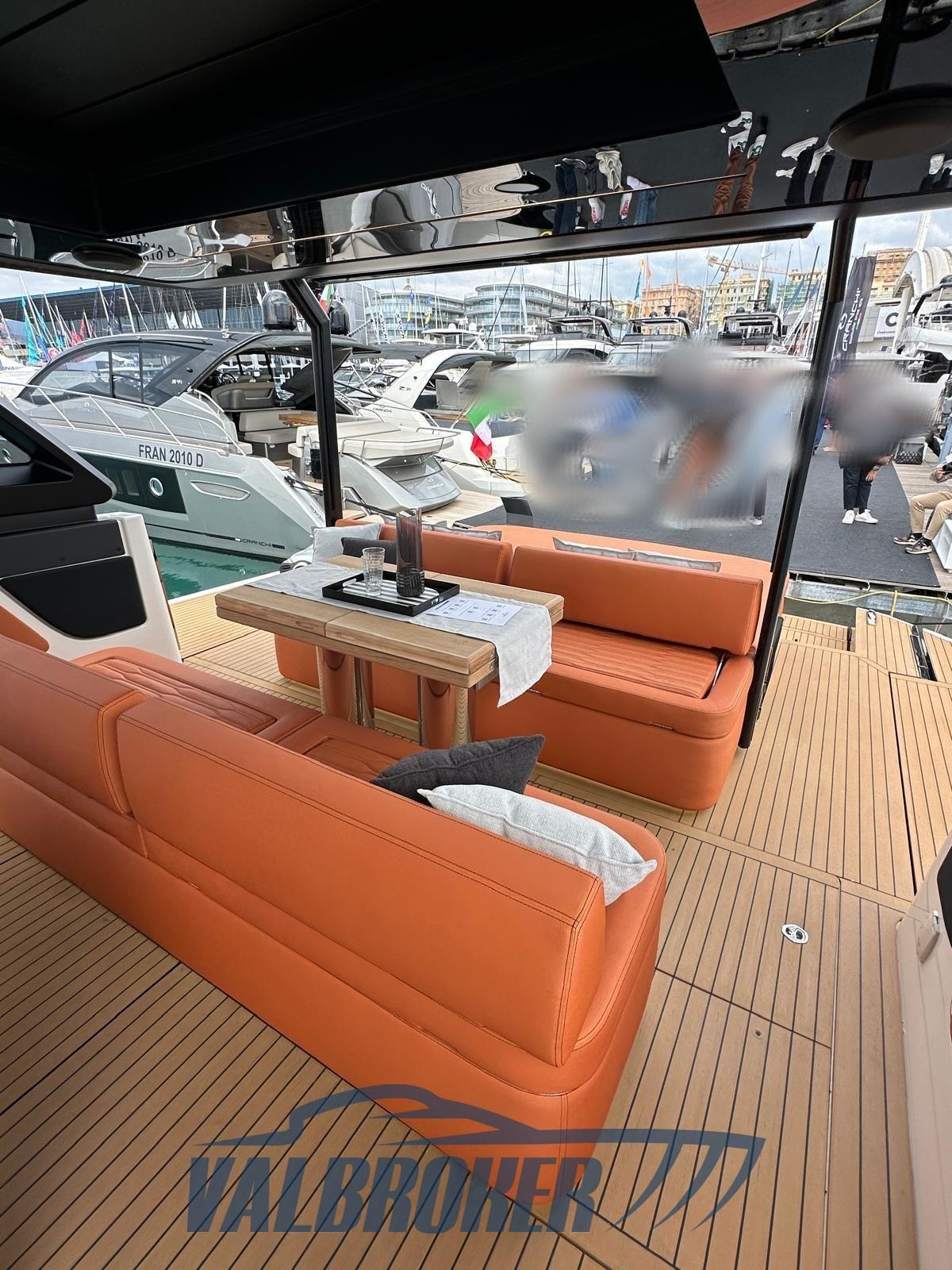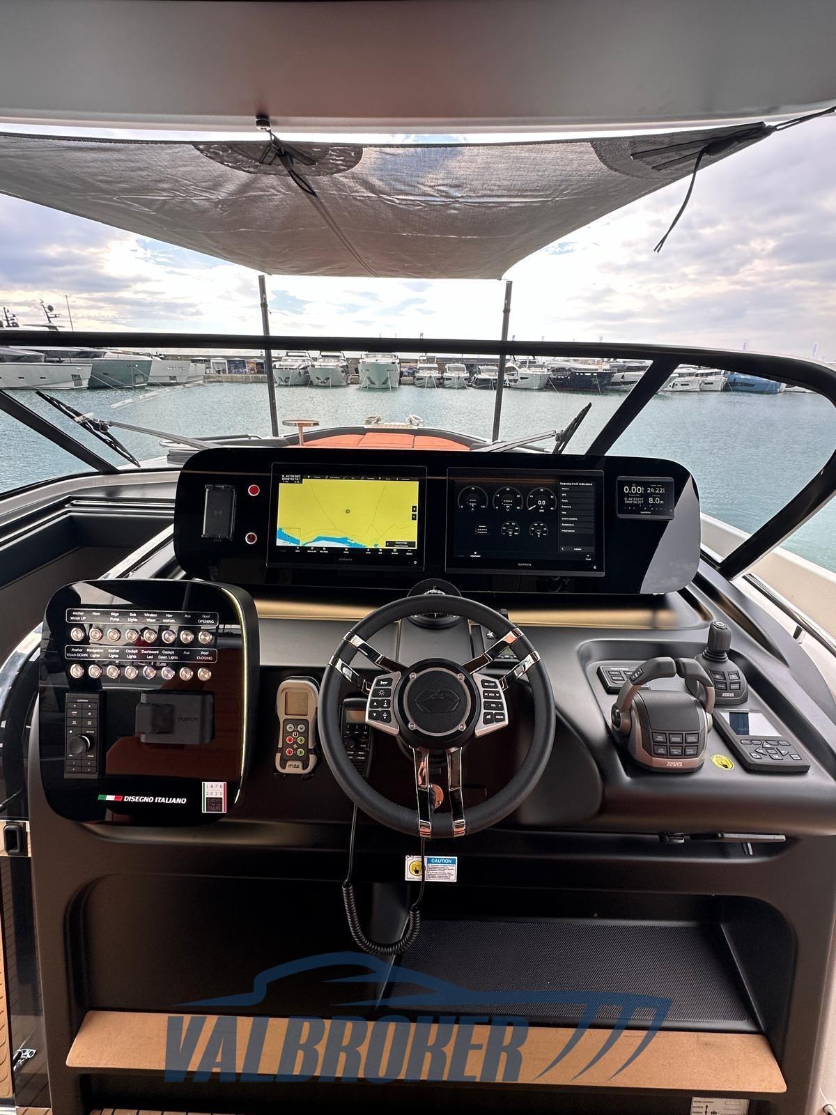 Alarme moteur, Ancre (digitale VOLVO PENTA DPS + assisted docking), Auto Dynamic Trim Interceptor, Eau sous pression, 4 Batteries, Passavant en teck (sintetico), Douche de cockpit, Propulseur d'étrave (proporzionale), Flaps hydrauliques, Lavabo dans le cockpit, Éclairage de courtoisie, 6 Spots sous-marins, Passerelle (idraulica), Plateforme arrière (idraulica tender-lift 130 kg), Pompe de cale automatique, Cockpit en teck (sintetico), Connexion eau sous pression à quai, Guindeau électrique, Echelle de bain, table de cockpit (teak), T-Top.
