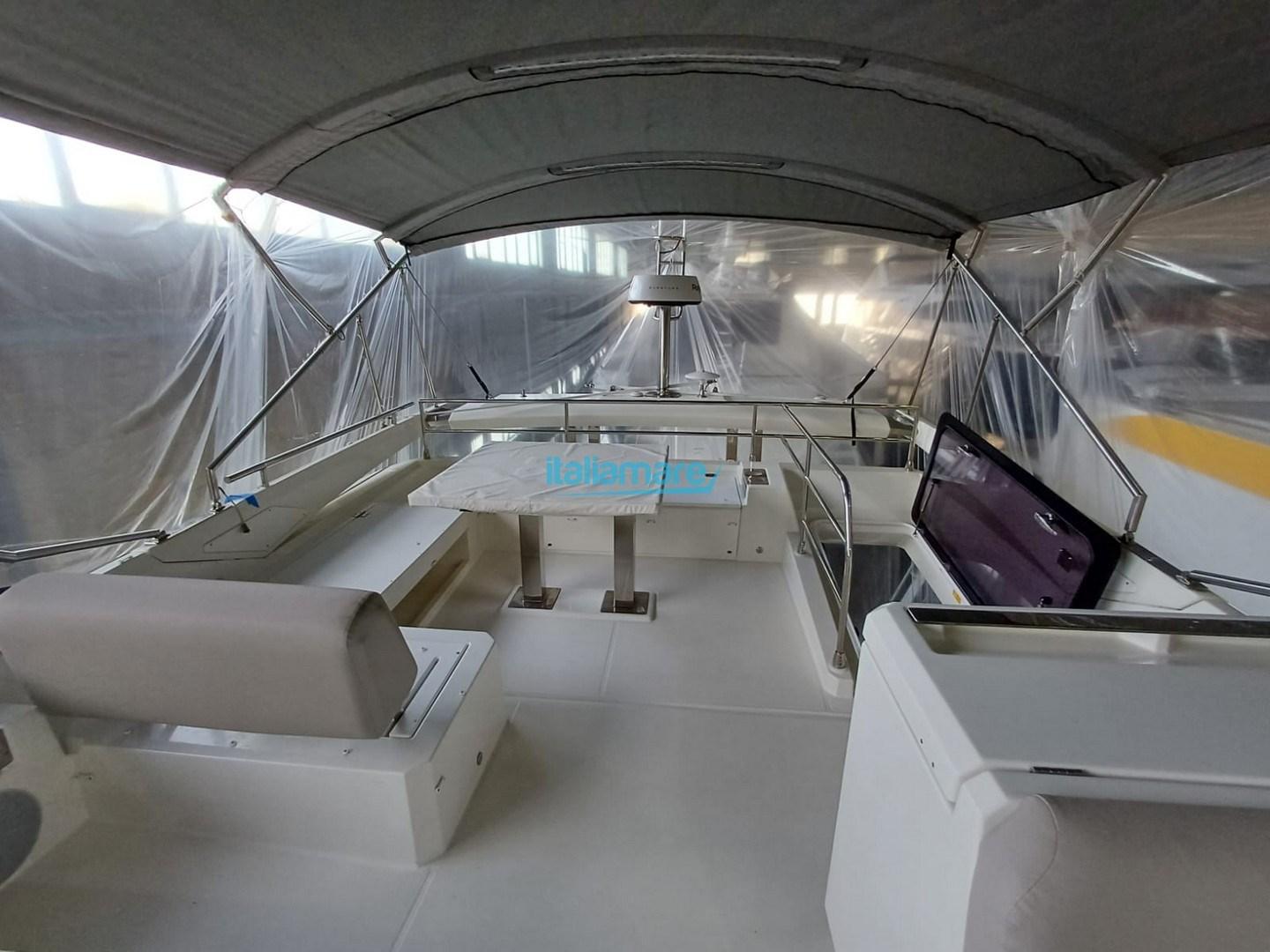 Bateau flybridge avec une zone de soleil de taille généreuse à la poupe.